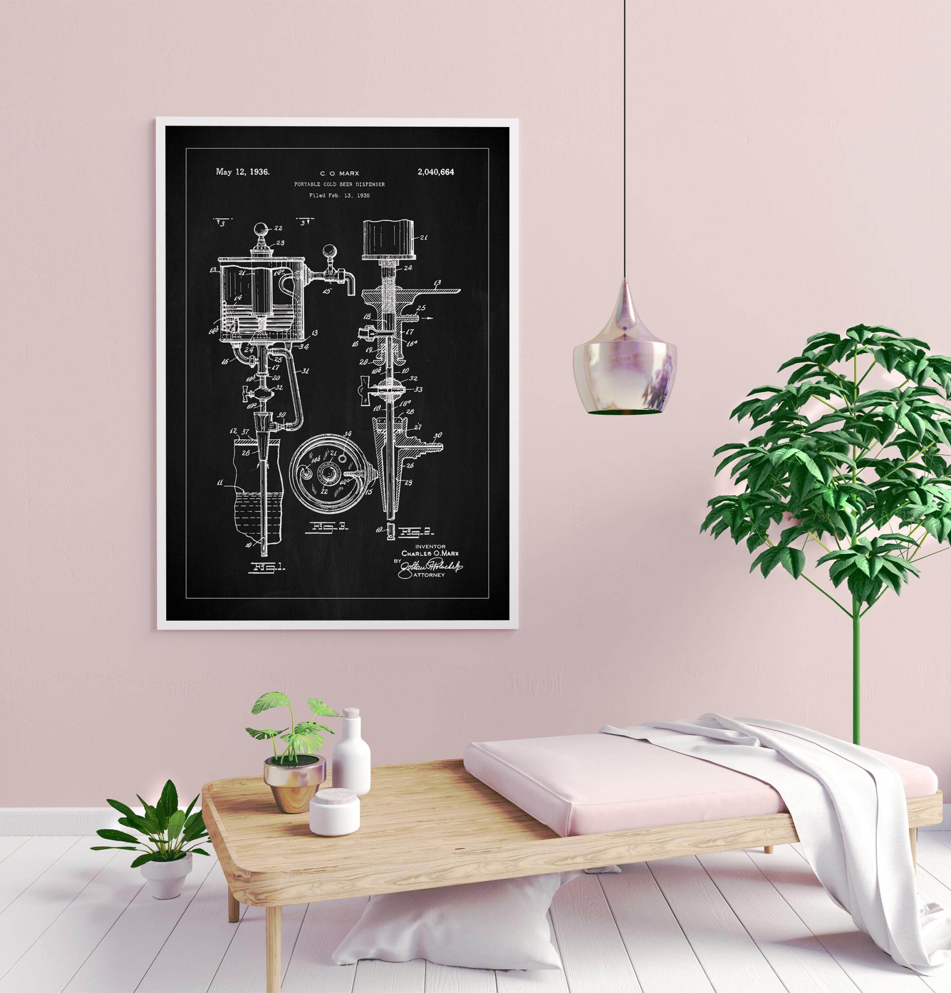 Cette affiche de brevet exclusive en noir et blanc présente une conception ingénieuse pour un distributeur de bière portable, brevetée le 12 mai 1936 par Charles O. Marx. Le dessin de brevet détaillé, avec le numéro de brevet 2,040,664, offre un aperçu technique et historique des innovations des années 1930 dans la technologie des boissons. L'illustration soigneusement reproduite dépeint chaque composant et mécanisme, ce qui en fait un élément de décoration idéal pour les collectionneurs, les passionnés d'histoire ou comme un élément de décoration élégant dans une maison moderne.