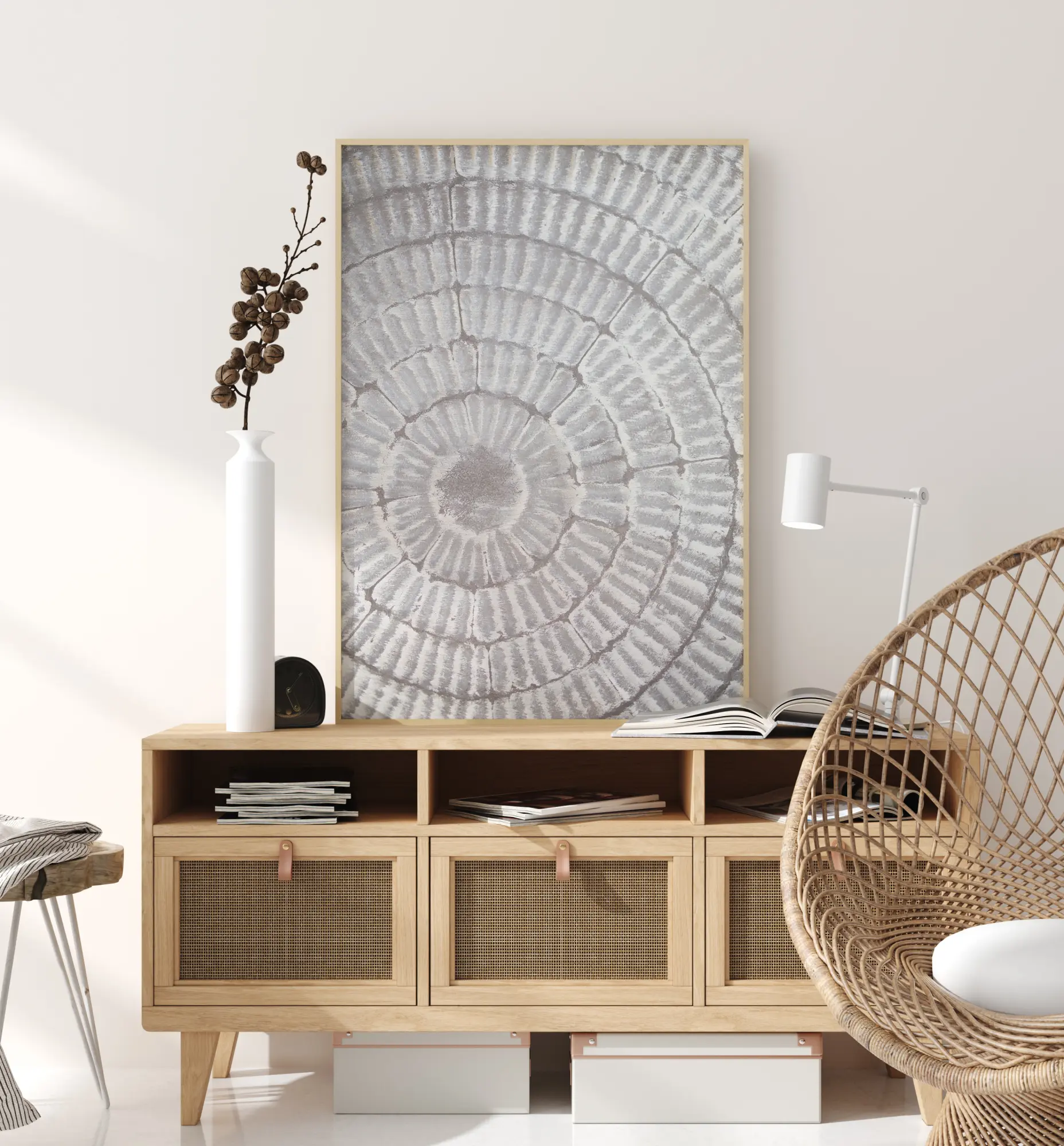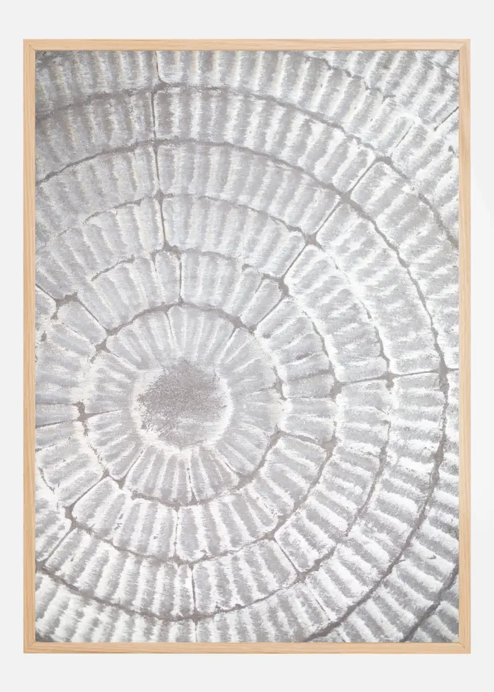 Une image vitreuse d'une assiette à motifs gris. Les anneaux circulaires beiges et blancs donnent à l'assiette un aspect nervuré et forment un cercle lisse parfait au milieu. Avec ses couleurs douces et apaisantes, cette charmante affiche crée une atmosphère mystérieuse et paisible. Idéale pour un mur coloré.