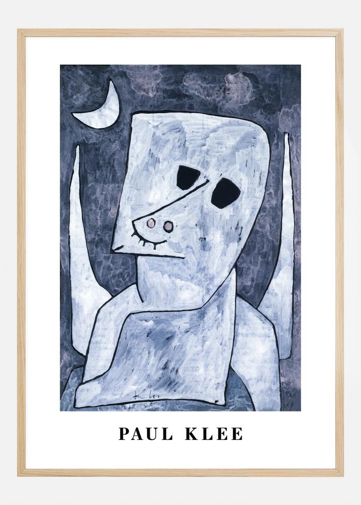 L'intérêt connu de Klee pour le surnaturel et le métaphysique apparaît clairement dans cette affiche. Un fin croissant de lune pend en arrière-plan, ajoutant un élément de mystique cosmique et complétant le regard et la pose de la figure centrale. Cette impression est non seulement un hommage au style unique de Klee, mais offre également un sujet de discussion qui éveillera la curiosité et enrichira toute pièce où elle sera placée. Sa diversité de tons bleus, allant d'un bleu céleste presque noir, fait de cet article une pièce de décoration polyvalente et intrigante.