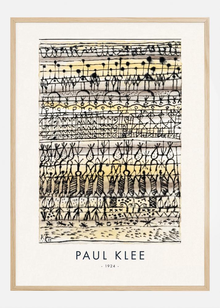 Ce poster représente l'œuvre de Paul Klee "Cooling in a Garden of the Hot Zone" de 1924, un motif complexe de lignes et de formes rappelant un jardin dans un paysage abstrait. D'une manière ludique, Klee explore des thèmes de nature et de structure en empilant des couches d'éléments symboliques et géométriques les uns sur les autres, créant une composition rythmique et presque musicale. L'utilisation variée des types de lignes et des couleurs contrastantes donne vie au jardin abstrait de manière typique pour l'art de Klee.