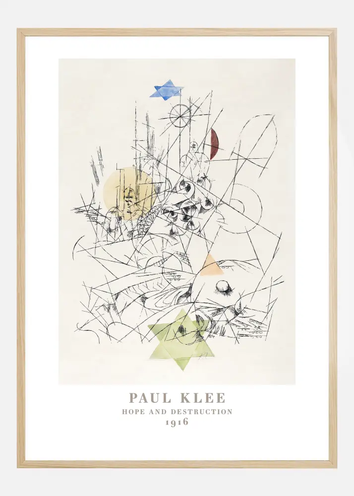 Cette affiche artistique représente une œuvre de Paul Klee, intitulée "Espoir et Destruction" de 1916, et capture une combinaison unique d'art abstrait et de symbolisme caractéristique du style de Klee. Le motif est riche en lignes et formes qui interagissent à travers la surface de la composition, offrant une sensation à la fois d'ordre et de chaos. C'est une impression qui pourrait séduire ceux qui apprécient l'art moderne et contemporain, idéale pour ajouter une dimension réfléchie à n'importe quelle pièce ou bureau.
