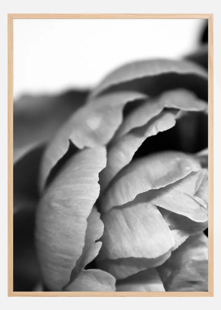 Une affiche en noir et blanc d'une pivoine en gros plan. Ses pétales blancs se recourbent gracieusement les uns sur les autres pour former une structure semblable à un chou. Sur un fond flou, vous pouvez admirer les feuilles parfaitement formées de cette fleur délicate. Une affiche parfaite pour tous ceux qui aiment les fleurs.