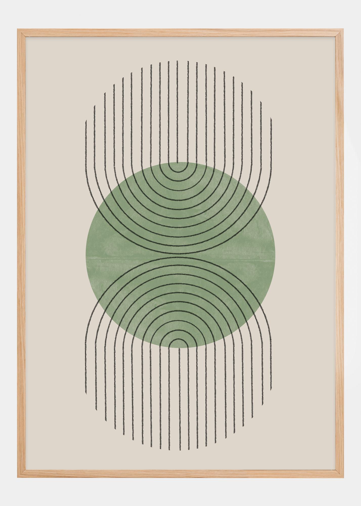 Cette affiche est une œuvre d'art minimaliste mettant en valeur une forme circulaire verte saturée entourée d'une série de lignes noires, ce qui procure une sensation d'espace et de profondeur. La teinte verte du cercle varie en intensité, créant un effet visuel de dimension et de texture. Les lignes, qui s'étendent vers l'extérieur depuis le bord du cercle, créent un effet presque hypnotique et illustrent une harmonie géométrique.
