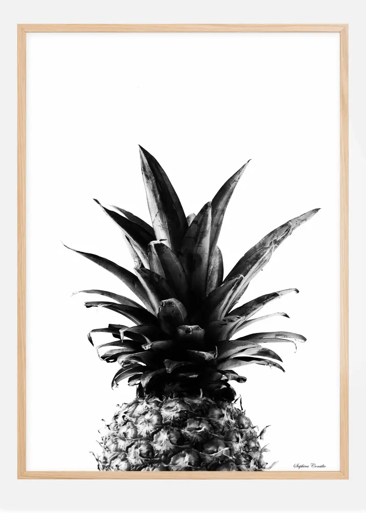 Un poster photographique en noir et blanc d'un ananas sur un fond blanc, photographié par Saphira Consilio. Une image élégante au design moderne, facile à combiner avec d'autres posters sur un grand mur de tableaux.