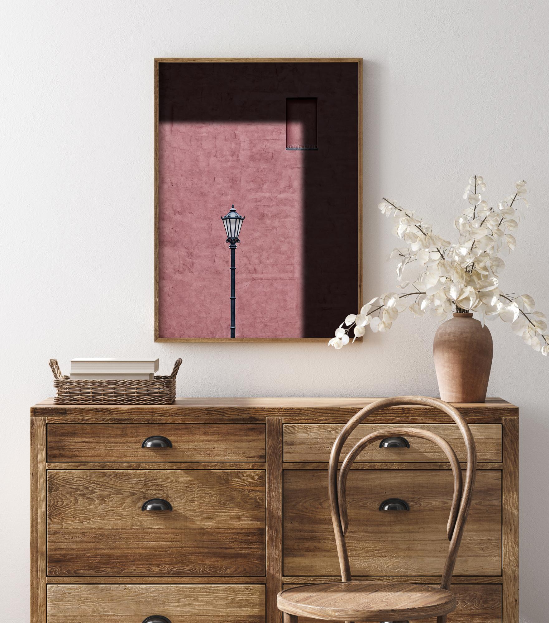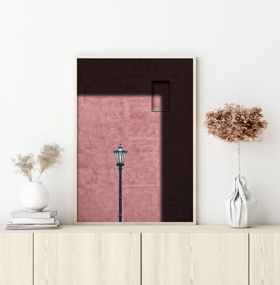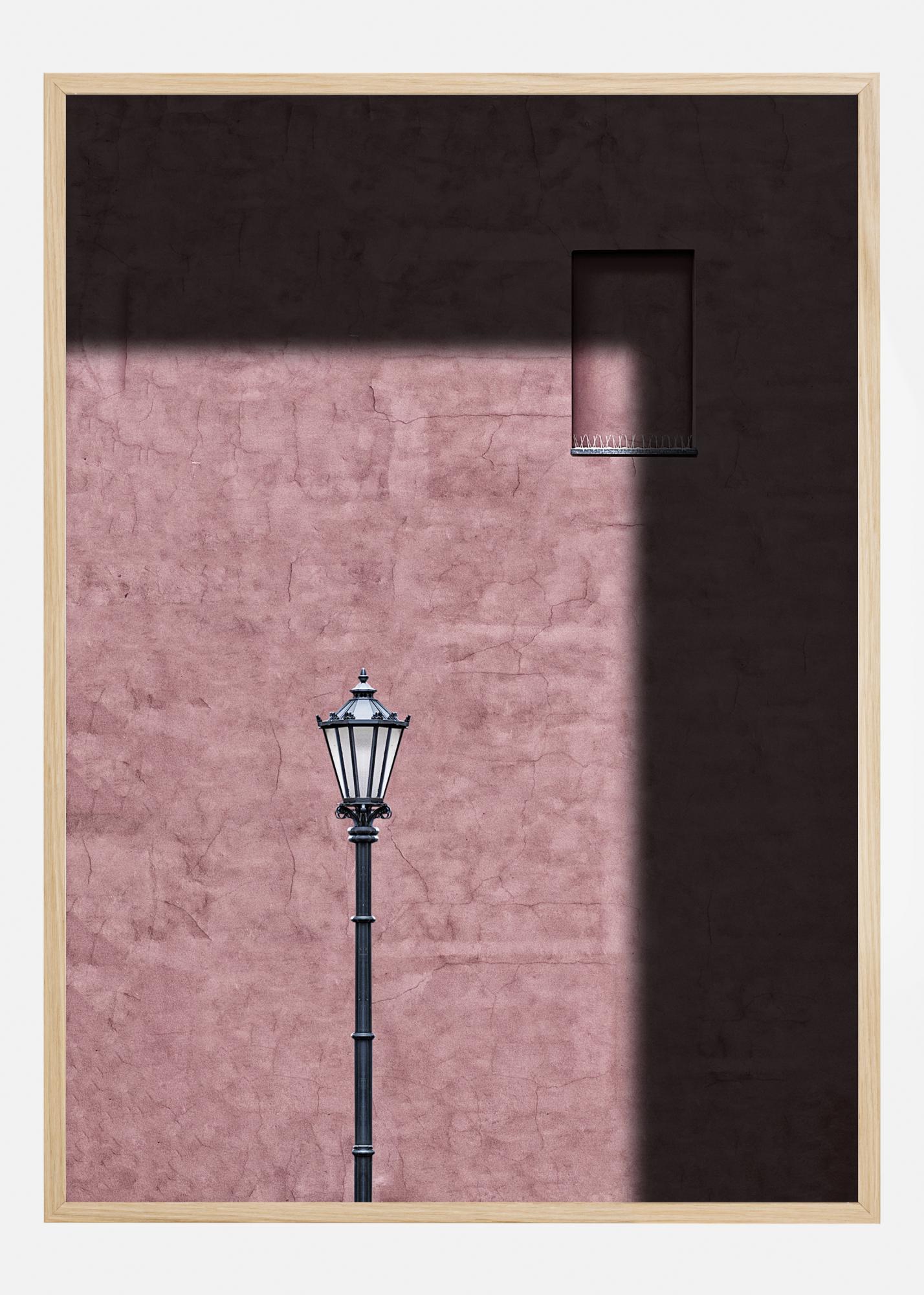 Une impression colorée d'une façade rose avec une lampe d'extérieur au centre. La lumière naturelle du soleil éclaire le mur, laissant la partie supérieure de l'impression dans l'obscurité. Une petite fenêtre murée est visible dans le coin supérieur droit. Apportez un peu de lumière dans votre maison avec cette affiche rose tendre.