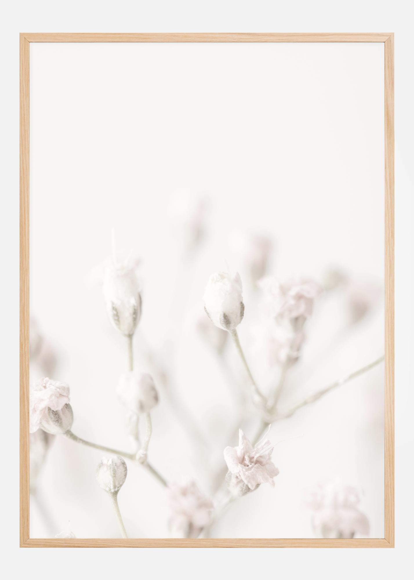 Une adorable photo en gros plan de petites fleurs roses soutenant fortement la chute de neige blanche. Les fleurs ne sont que faiblement visibles sur le fond blanc flou, grâce à leurs pétales rose tendre. Faites entrer le monde merveilleux hivernal dans votre maison avec cette superbe affiche.