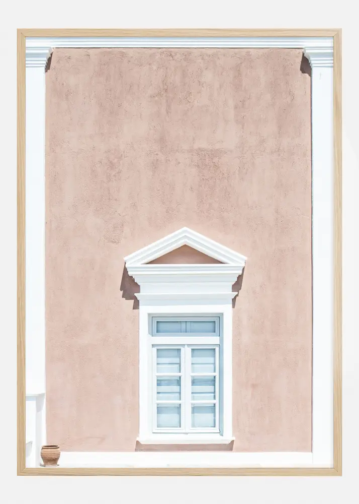 Donnez à votre mur une touche de grâce architecturale avec cette affiche tendance qui montre le contraste entre l'architecture classique austère et la sensation chaleureuse et accueillante d'une façade méditerranéenne. Au centre du motif se trouve une fenêtre entourée d'un fronton blanc et détaillé, encadrée par un mur rose rustique. Les volets bleus apaisants offrent un contraste subtil mais élégant avec la surface rosée environnante, et un pot en terre cuite solitaire ajoute une sensation terreuse.