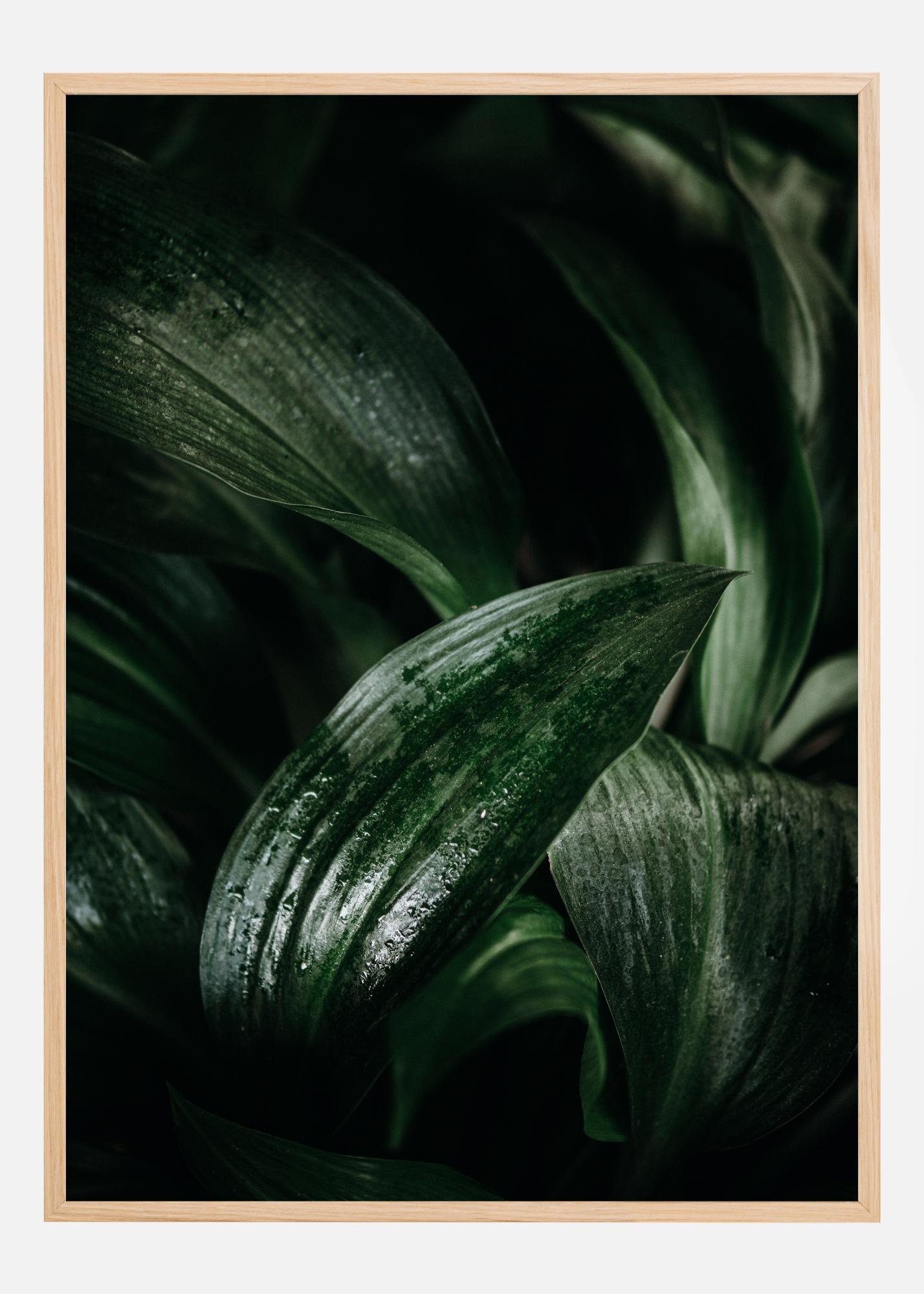 Une affiche en gros plan des feuilles mouillées qui recouvrent densément le tirage. Les gouttelettes d'eau sur la feuille créent une atmosphère brillante. L'arrière-plan sombre et flou représente d'autres feuilles qui luttent pour être capturées. Cette beauté sans défaut est parfaite pour votre maison.