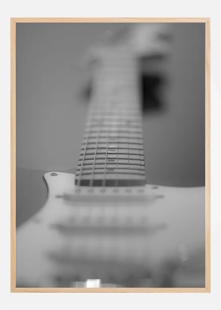 Cette affiche artistique capture l'essence de la musique et de la passion à travers une image détaillée et profonde d'une guitare. Avec un accent sur le chevalet et le manche de la guitare s'étendant vers une silhouette floue du corps de la guitare, cette image crée une perspective forte et un profond. La photo est en noir et blanc, ce qui donne une sensation classique et intemporelle, tandis que le cadre en bois autour du motif ajoute une touche chaleureuse et naturelle.