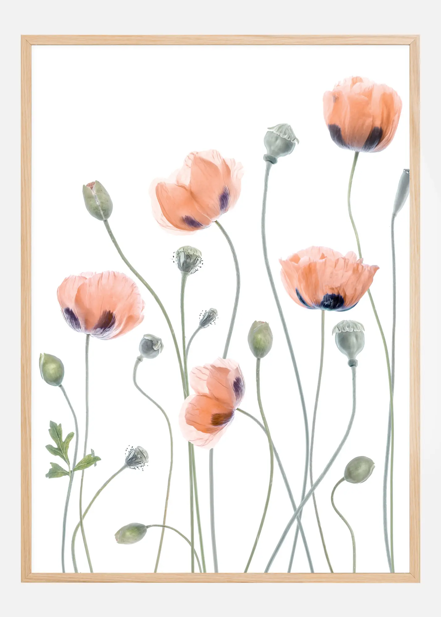 Un charmant poster de coquelicots entrelacés avec des herbes séchées. Sur un fond blanc, les coquelicots de couleur pêche se marient parfaitement avec les herbes vert clair. Chaque coquelicot est placé à une hauteur différente. Une belle affiche apaisante à accrocher dans une cuisine de campagne.