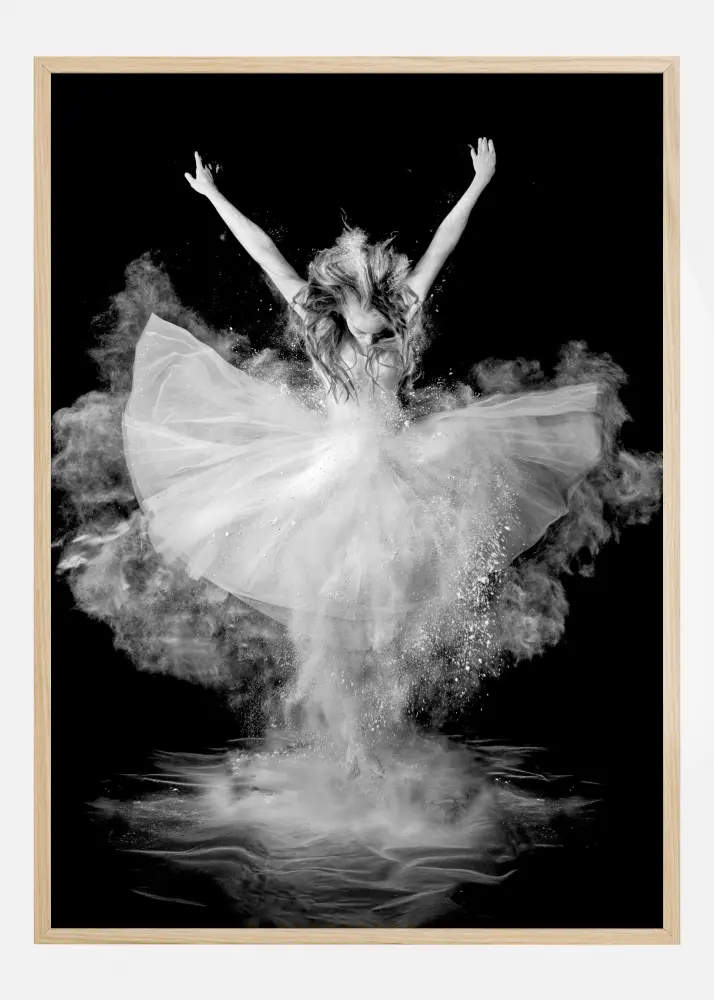 Une magnifique photo en noir et blanc d'une danseuse. Sur un fond noir, la danseuse semble évoluer sur l'eau. Sa robe de ballet blanche étant ouverte, une poussière blanche tombe de la robe et se reflète magnifiquement dans l'eau. Une sublime affiche à accrocher dans votre maison.