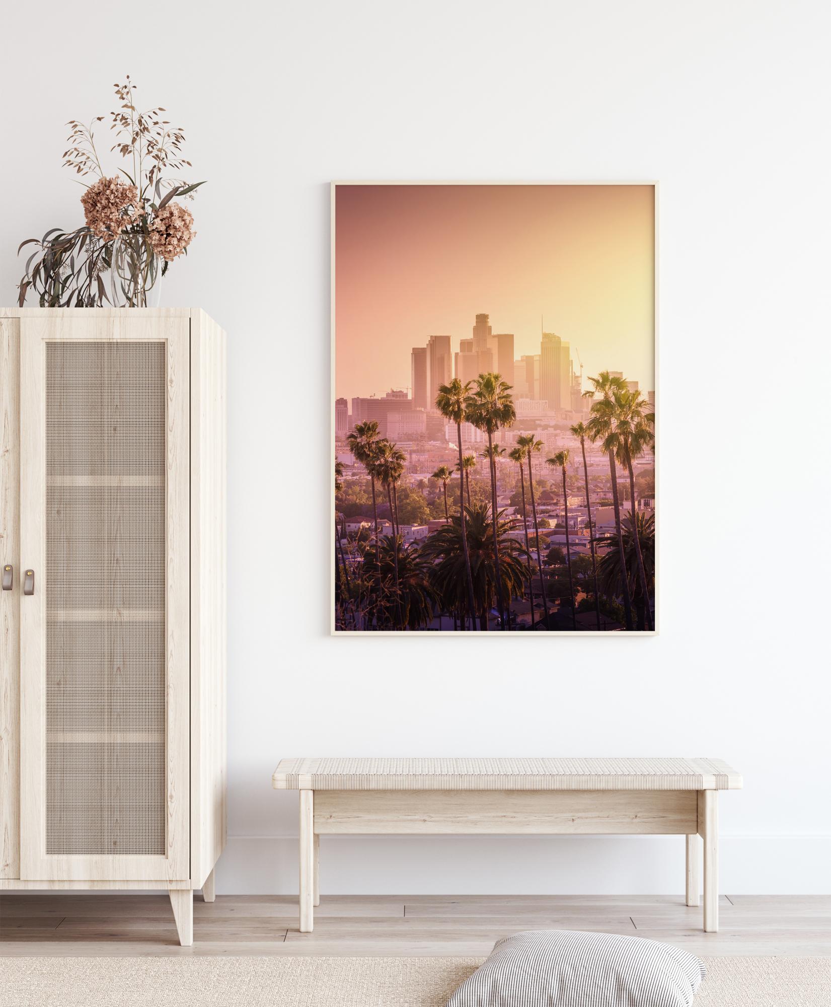 Affiche d'une ville prise de loin. Au premier plan, les grands palmiers dominent l'image, tandis qu'au loin, les gratte-ciel dominent la ville. Le ciel de couleur orange et violette se reflète sur les bâtiments de la ville, lui donnant un aspect violet. Un poster idéal pour tous ceux qui aiment l'architecture.