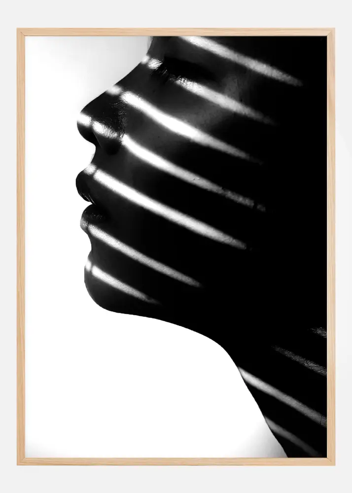 Une affiche étonnante capturant la lumière qui brille sur le visage et le cou d'une femme. Sur un fond blanc, la femme a les yeux fermés. La lumière naturelle qui traverse les volets crée une sensation de chaleur. Une affiche parfaite à accrocher dans un salon de beauté.