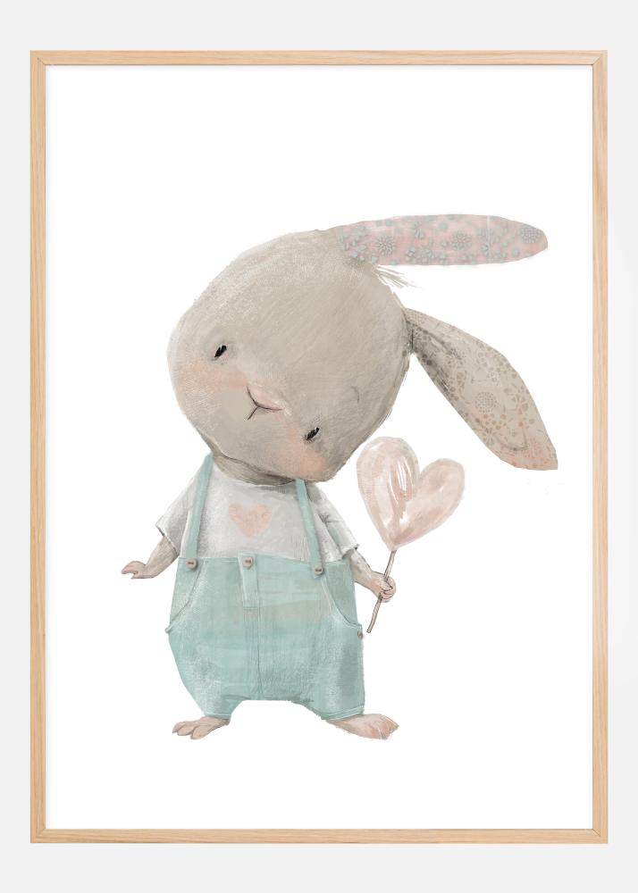 Cette affiche adorable montre un petit lapin tenant un ballon en forme de cœur, réalisée avec finesse et sensibilité à travers la peinture à l'aquarelle. Le regard doux et rêveur du lapin et le détail minutieux de ses vêtements, qui incluent des motifs floraux en pastel, donnent une sensation d'innocence et de pureté. Cette illustration est un hommage charmant à l'amour et à l'attention, évoquée par le ballon en forme de cœur.