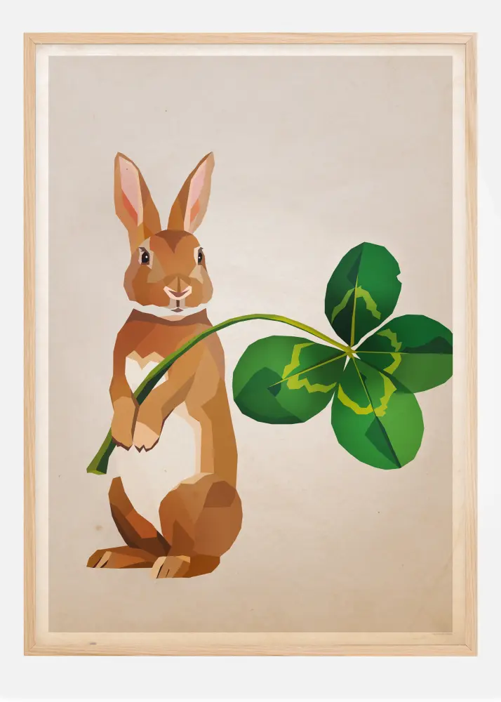 Un poster amusant d'un adorable lapin tenant un trèfle à quatre feuilles entre ses deux membres supérieurs. Sur une toile de fond beige, le lapin brun et blanc est assis sur ses pattes arrière et regarde droit dans l'appareil photo. Une affiche mignonne pour apporter un peu de chance dans votre maison.