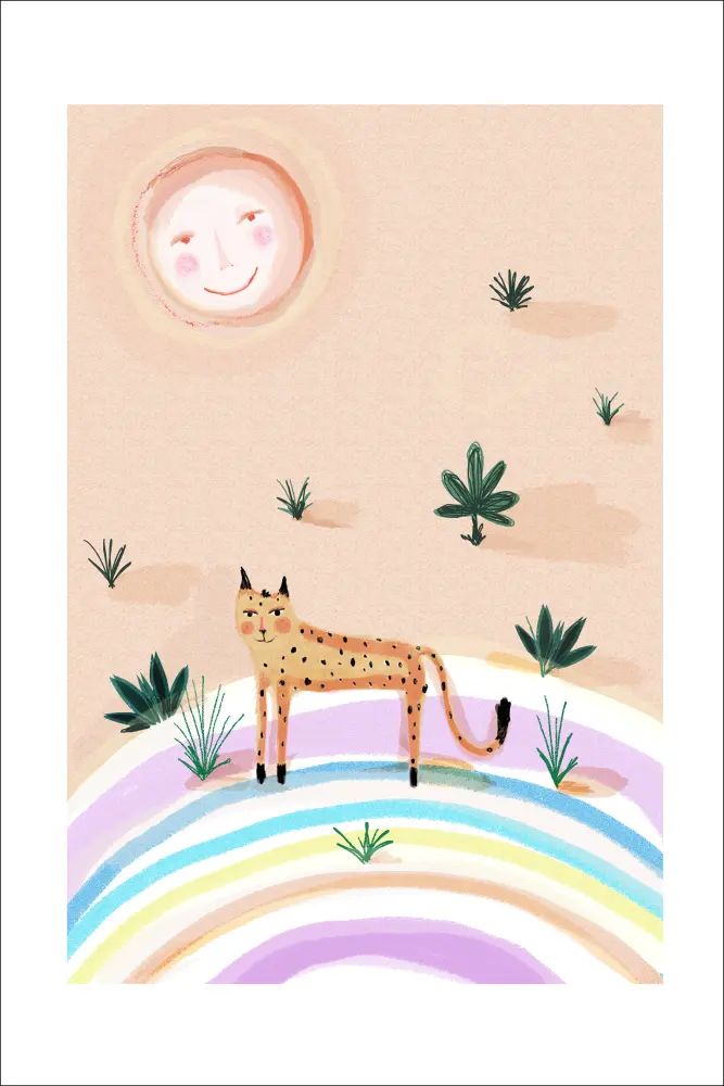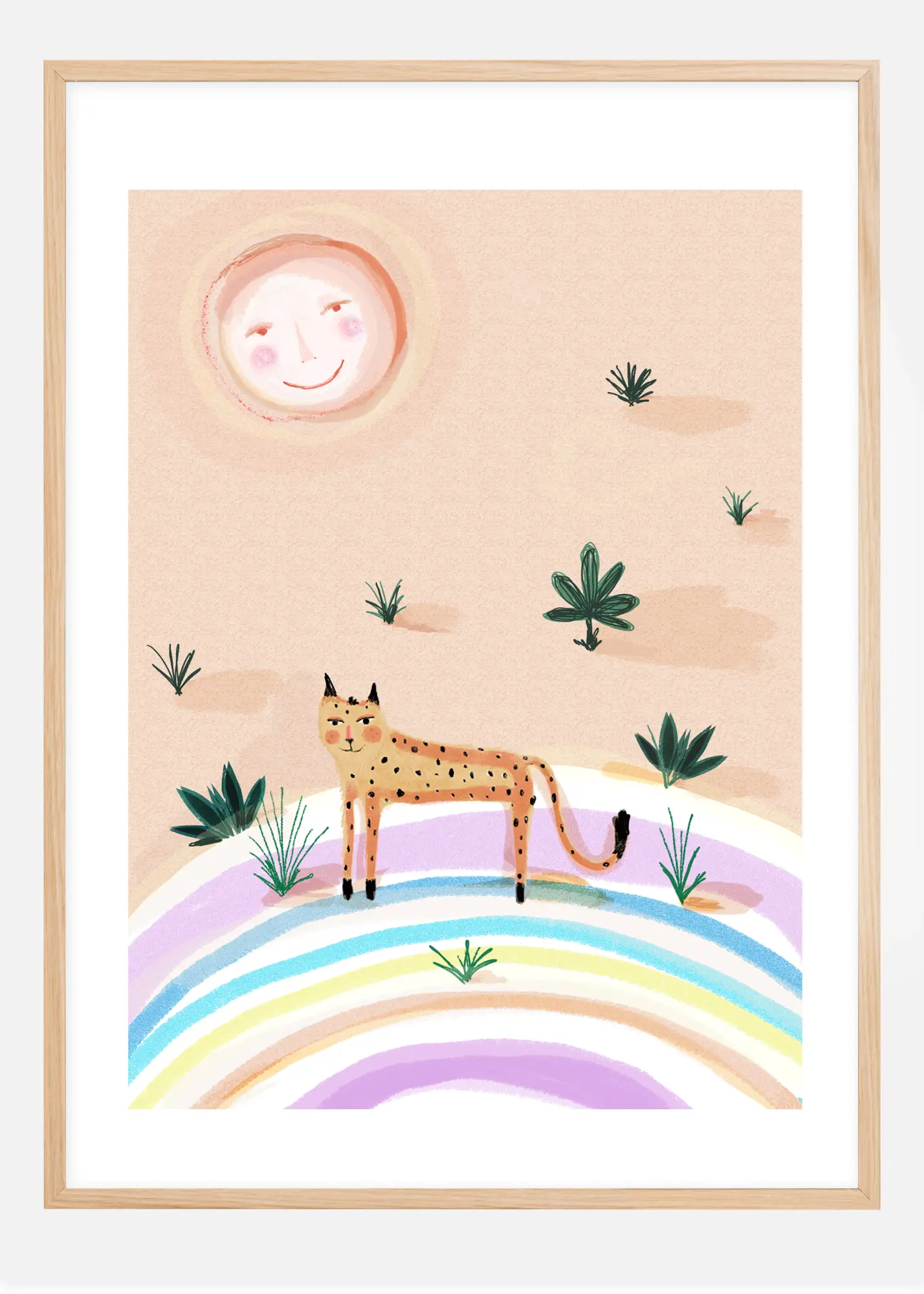 Une affiche amusante sur le désert avec un léopard et le soleil qui sourient tous les deux. Positionné sur une surface multicolore, le petit léopard fin est entouré de petites plantes du désert. Un imprimé idéal à accrocher dans la chambre de votre enfant pour créer une atmosphère joyeuse.