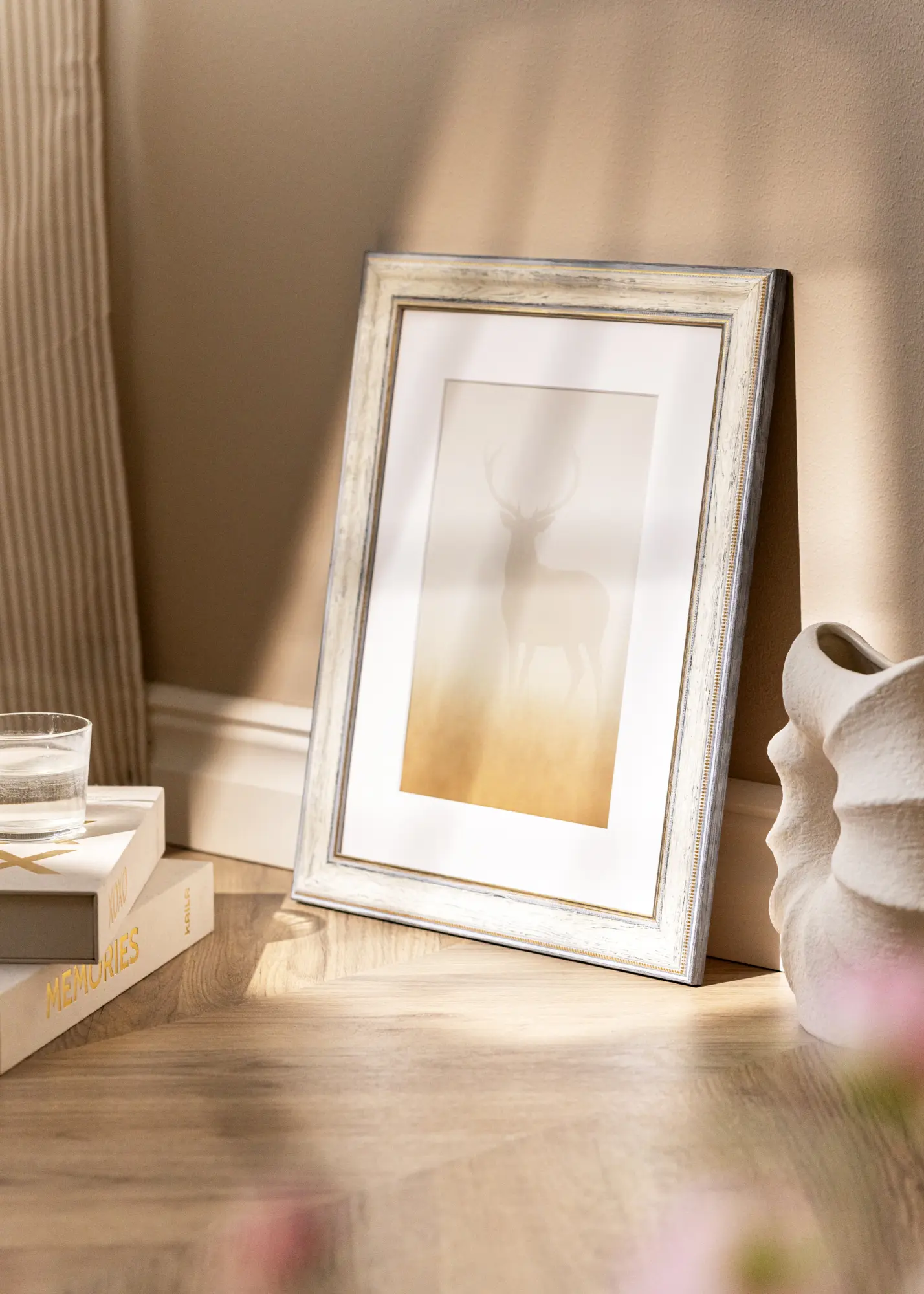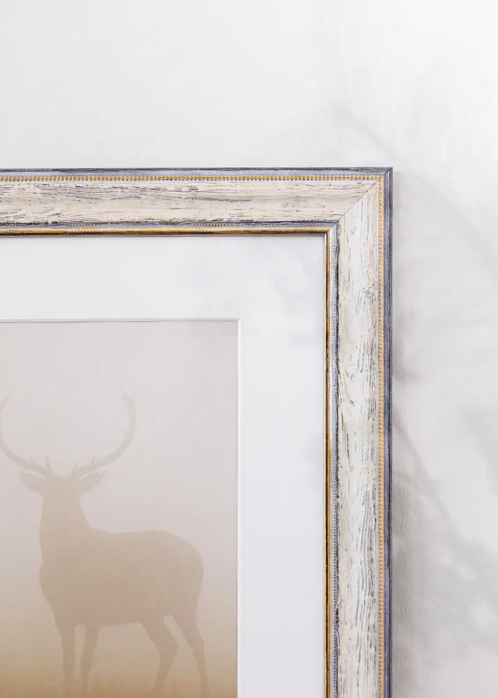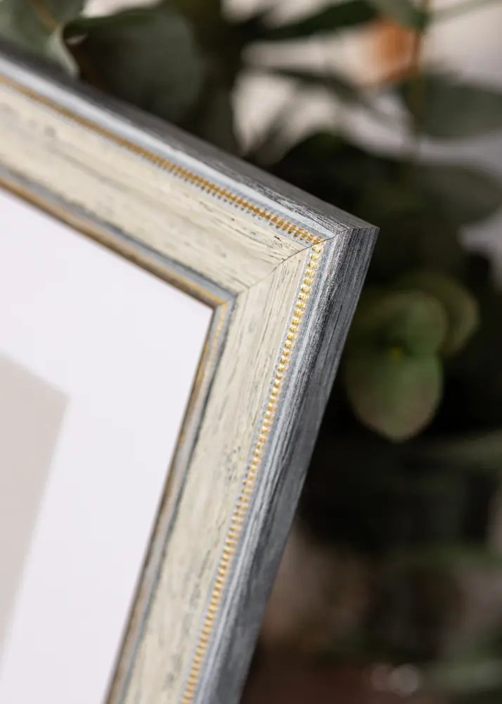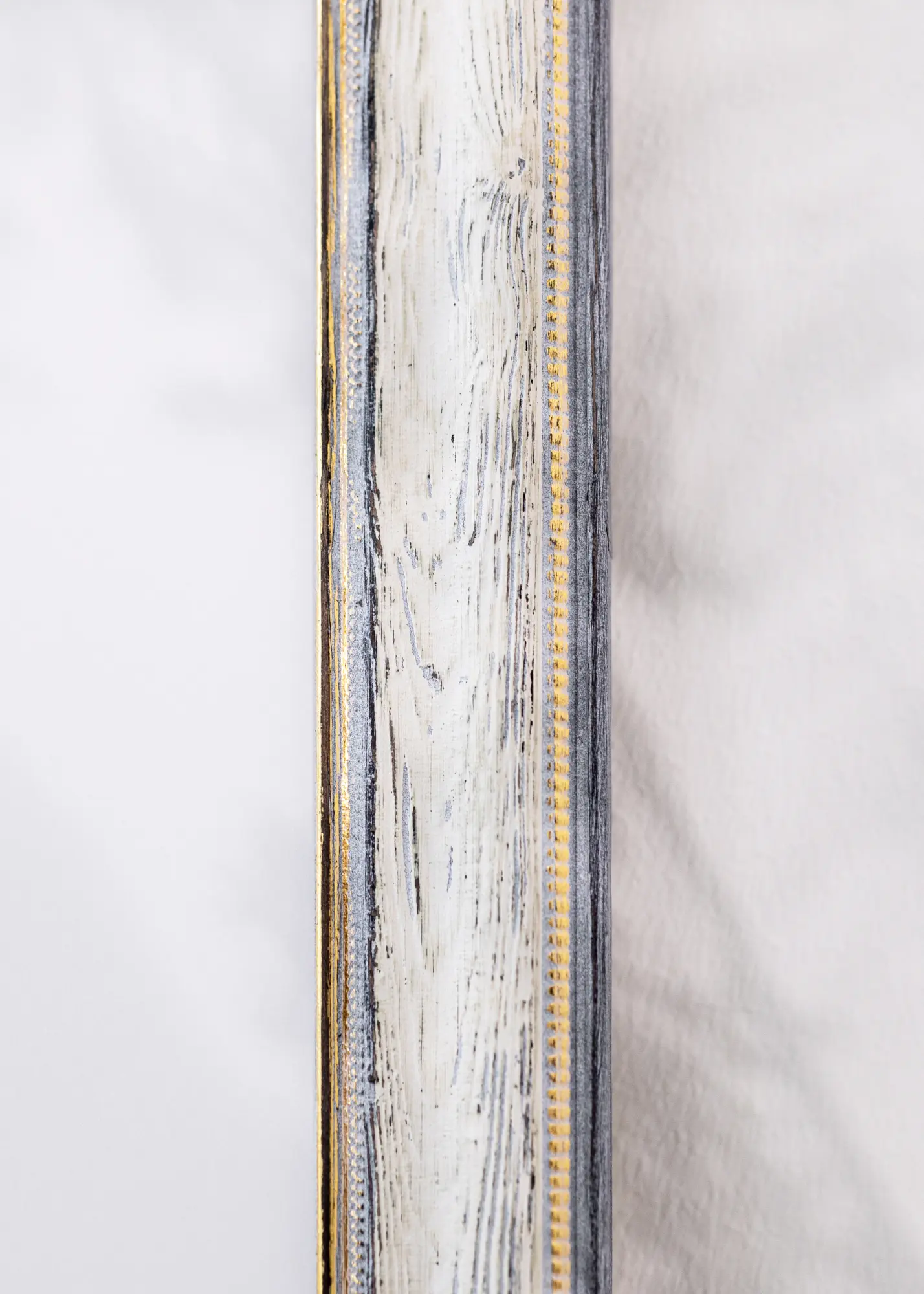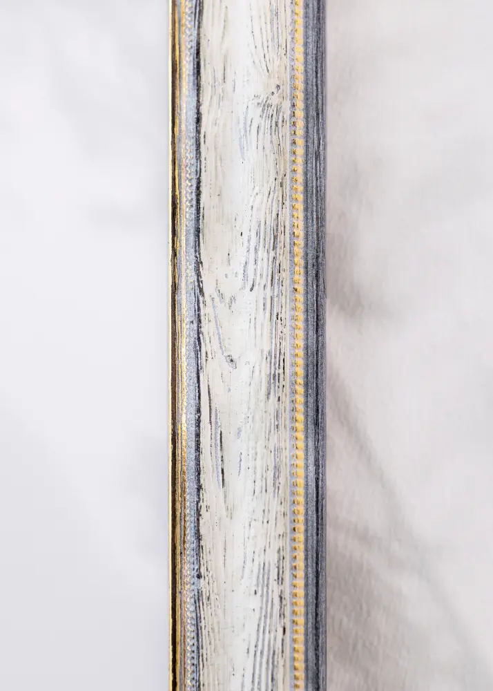Ce cadre photo élégant est une parfaite combinaison d'inspiration vintage et de fonctionnalité moderne. Avec sa finition en bois blanc et gris rustique, complétée par des détails dorés subtils le long du bord intérieur, il offre un look joliment vieilli. Le cadre est fabriqué en bois et présente un design profilé avec une structure en bois distincte, ce qui le rend idéal pour les styles d'intérieur campagnards, shabby chic ou classiques. Ce cadre est un excellent choix pour mettre en valeur les photographies et œuvres d'art avec une sensation intemporelle et sophistiquée.