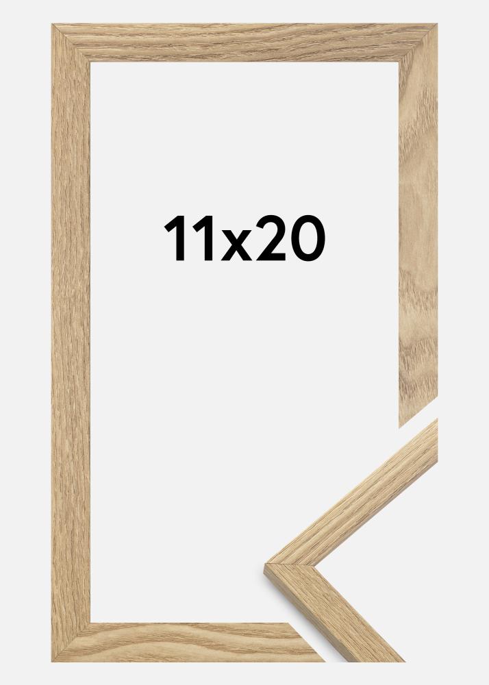 Le cadre, fabriqué en MDF avec placage en aluminium et une surface de couleur chêne est doté d'un mince profil de 14 mm. Il y a suffisamment d'espace pour combiner vos images avec un passe-partout luxueux, grâce à la profondeur intérieure du cadre (profondeur de baguette) de 12 mm.