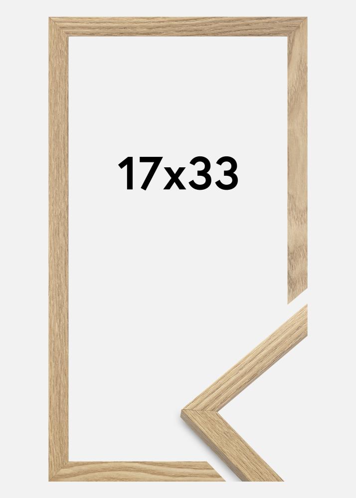 Le cadre, fabriqué en MDF avec placage en aluminium et une surface de couleur chêne est doté d'un mince profil de 14 mm. Il y a suffisamment d'espace pour combiner vos images avec un passe-partout luxueux, grâce à la profondeur intérieure du cadre (profondeur de baguette) de 12 mm.