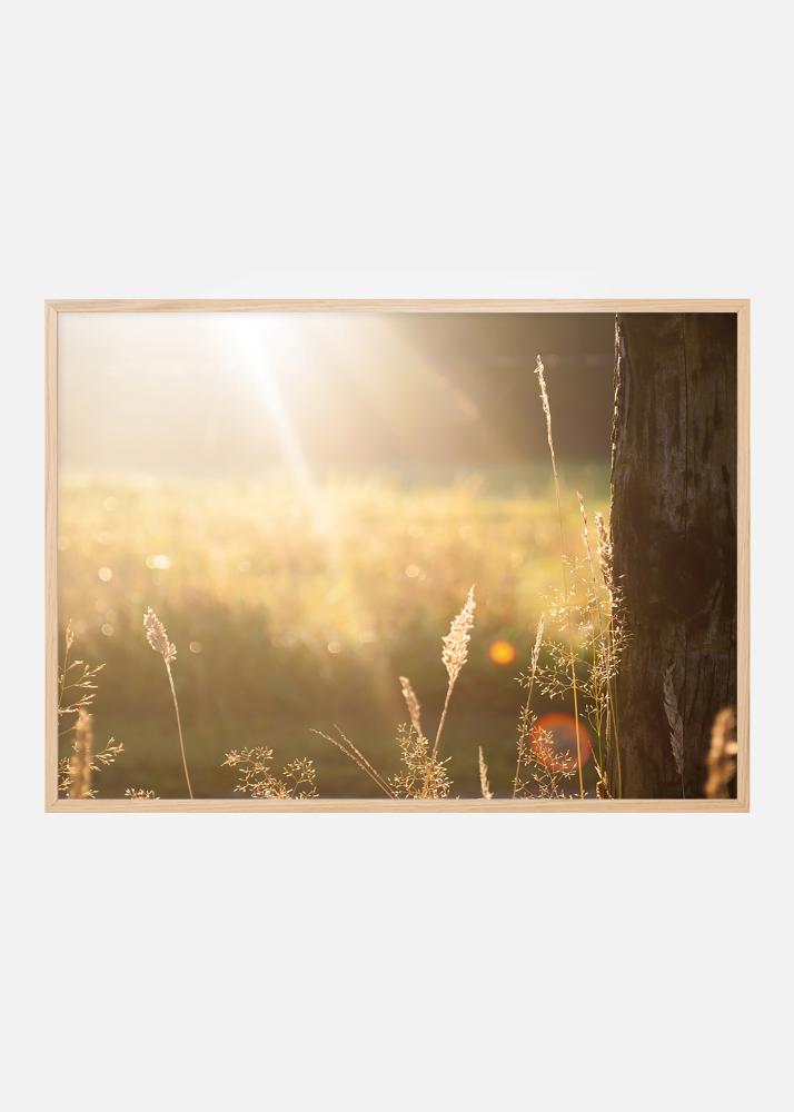 Affiche avec une photographie en contre-jour sépia d'une prairie en fin d'été avec des brins d'herbe en grain au premier plan. Le motif est paisible et on peut presque entendre le chant des sauterelles dans la douce soirée d'été. Le poster s'intègre bien dans tous les types de styles d'intérieur avec sa palette de couleurs atténuées et est beau à accrocher avec d'autres motifs naturels.