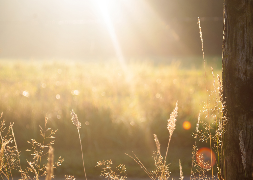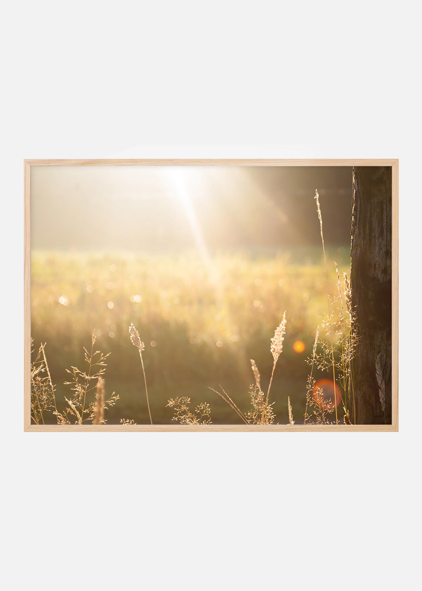 Affiche avec une photographie en contre-jour sépia d'une prairie en fin d'été avec des brins d'herbe ensemencés au premier plan. Le motif est paisible et on peut presque entendre le chant des sauterelles dans la douce soirée d'été. Le poster s'intègre bien dans tous les types de styles d'intérieur avec sa palette de couleurs atténuées et est joli à accrocher avec d'autres motifs naturels.