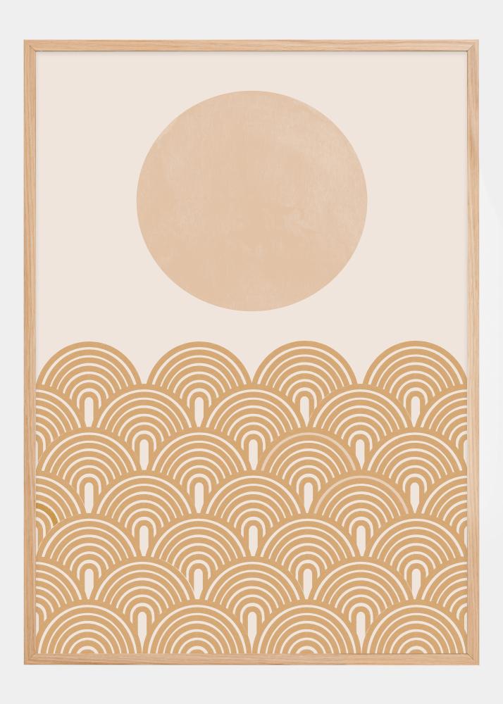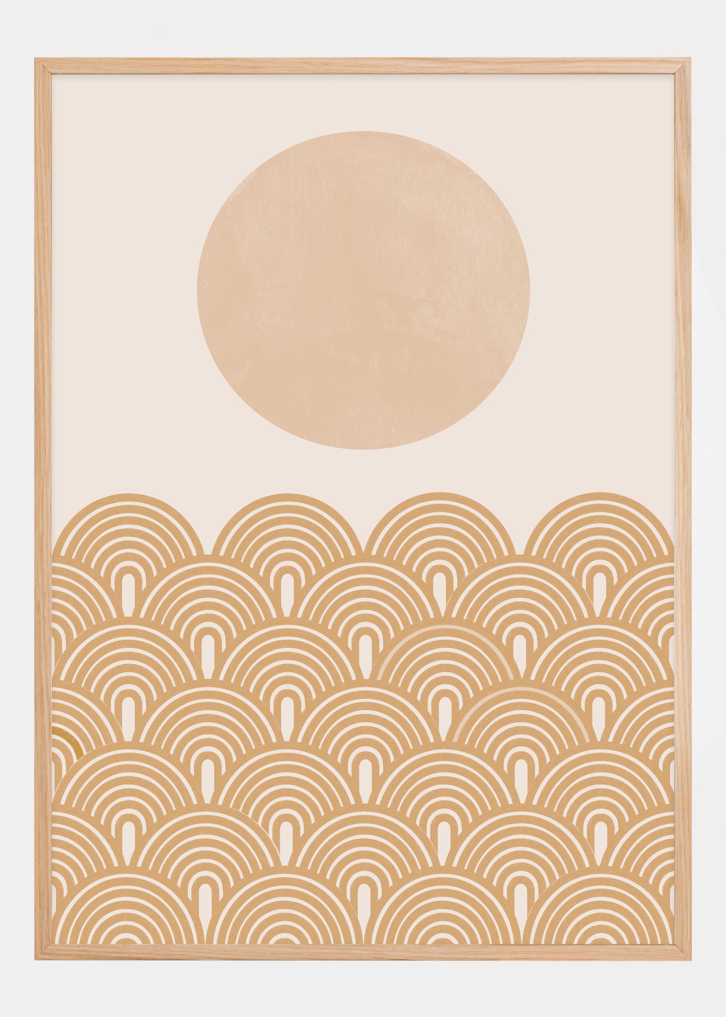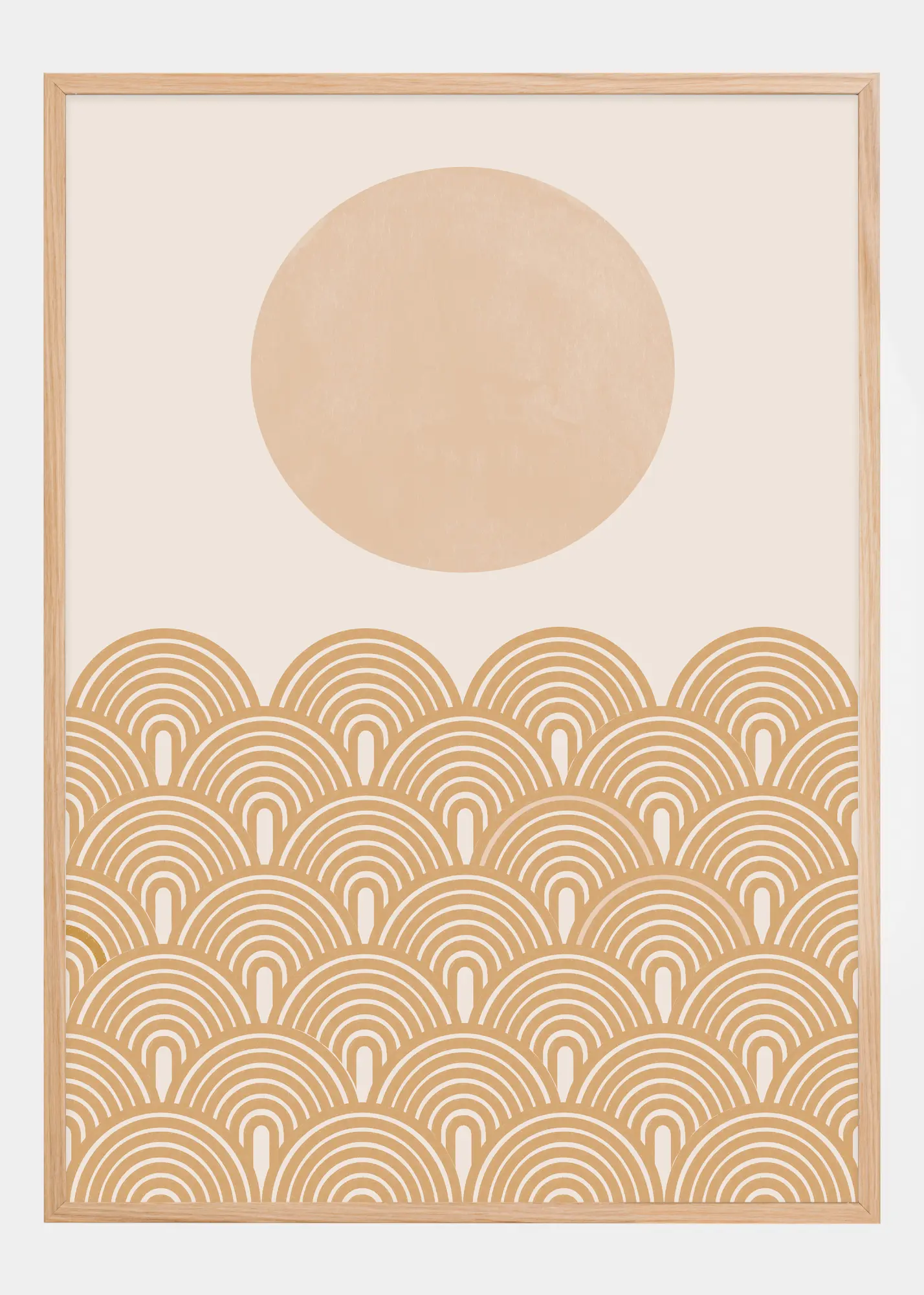 Ce poster est une interprétation ensoleillée des styles rétro et des vibrations estivales, où un grand cercle rose pâle flotte au-dessus d'un motif d'éléments arqués dans une teinte chaude de terracotta. Les arcs sont interconnectés d'une manière qui rappelle des vagues ou des collines, ce qui donne une sensation de mouvement et de vivacité. La palette de couleurs douce contribue à une sensation de chaleur et de calme.