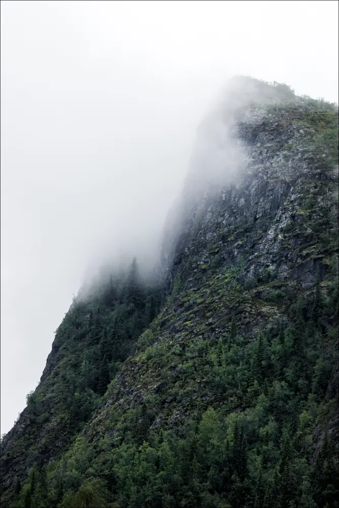 Un magnifique poster du flanc d'une montagne avec des arbres. Le sommet de la montagne est légèrement obscurci par un nuage, ce qui contribue à créer un air de mystère. Imaginez grimper sur ce sommet pour admirer la vue lorsque vous ajouterez cette affiche à votre intérieur.