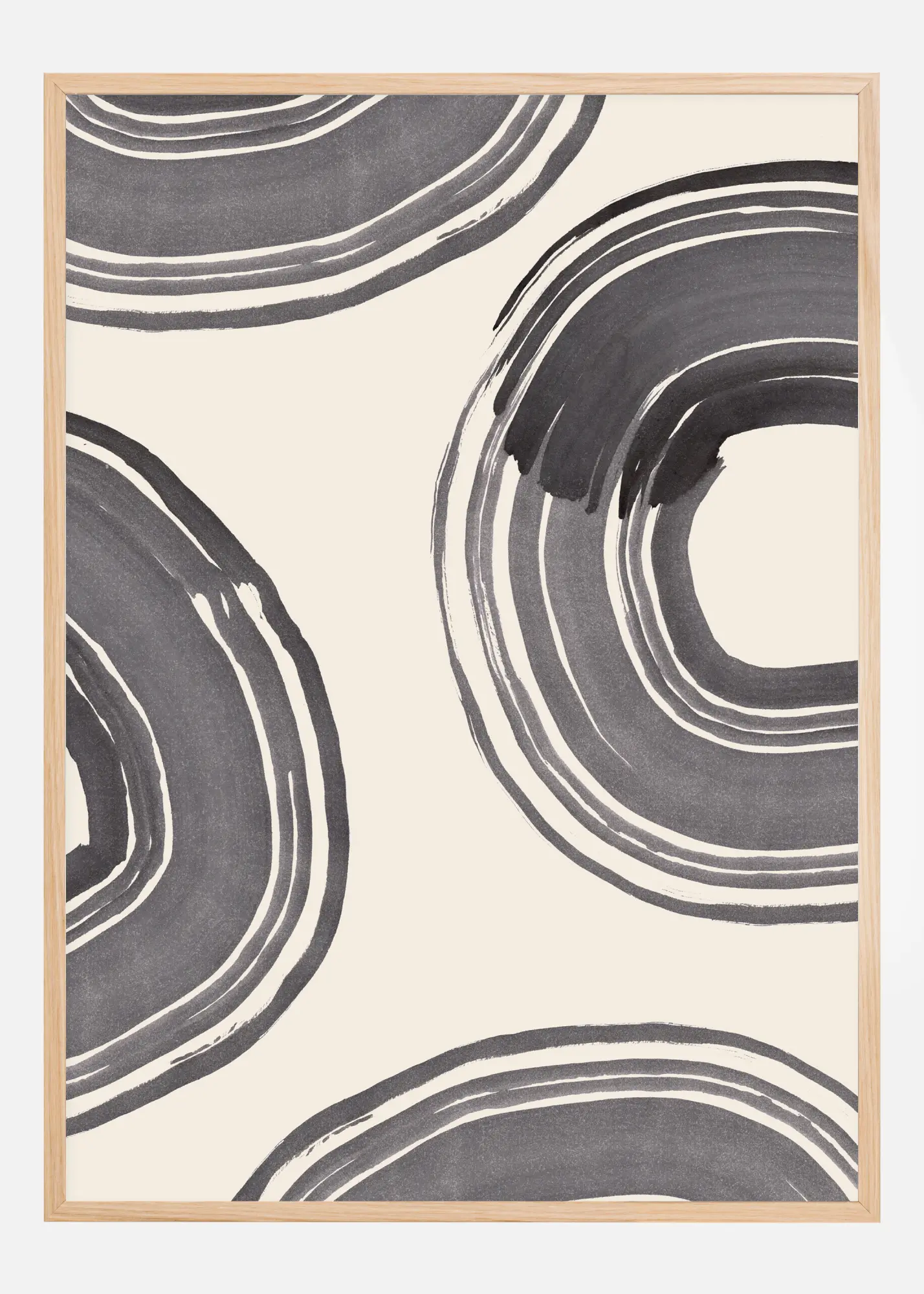 Une affiche avec différents motifs tourbillonnants en gris. Ces cercles sont les anneaux de la vie, car tout tourne dans un cercle géant pour revenir au point de départ. Les cercles sont constitués de différentes épaisseurs sur un fond blanc. Pour une ambiance artistique, associez-les à un mur de votre couleur vive préférée.