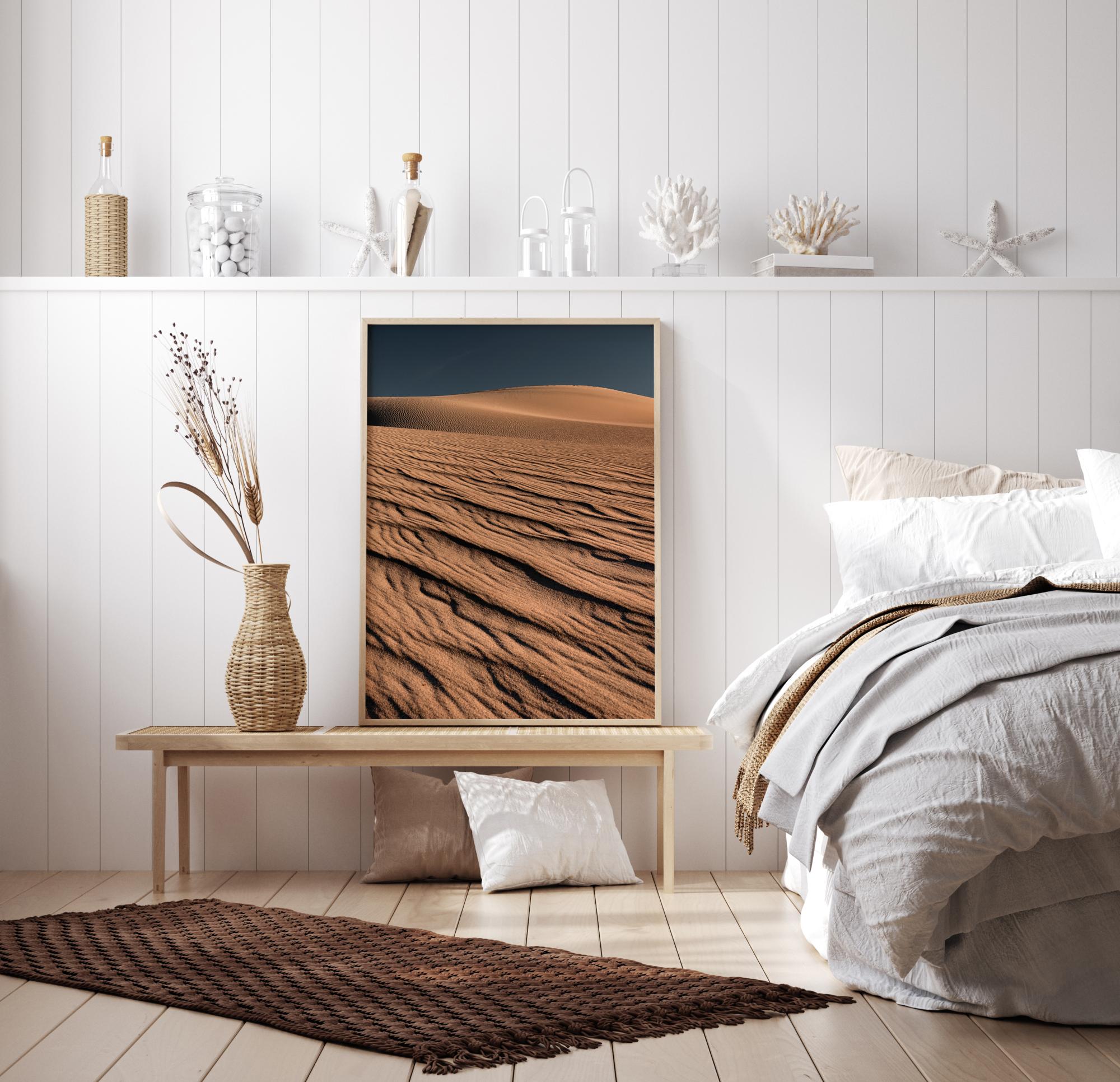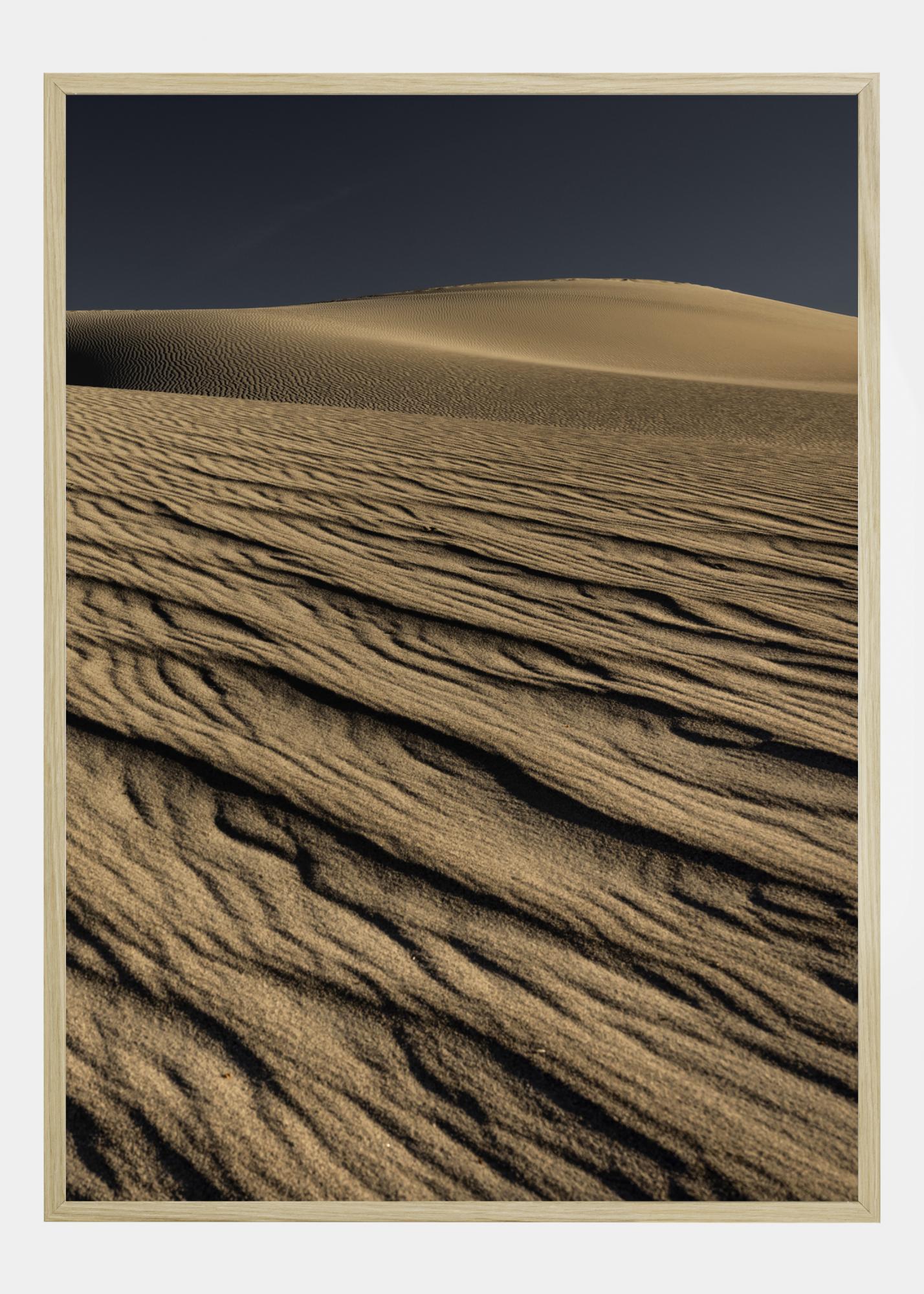 Un poster dramatique de vagues de sable sur les dunes. Ce cliché étonnant crée une harmonie avec le contraste entre le sable jaune et le ciel bleu. Encadrez cette affiche dramatique chez vous pour attirer les regards.