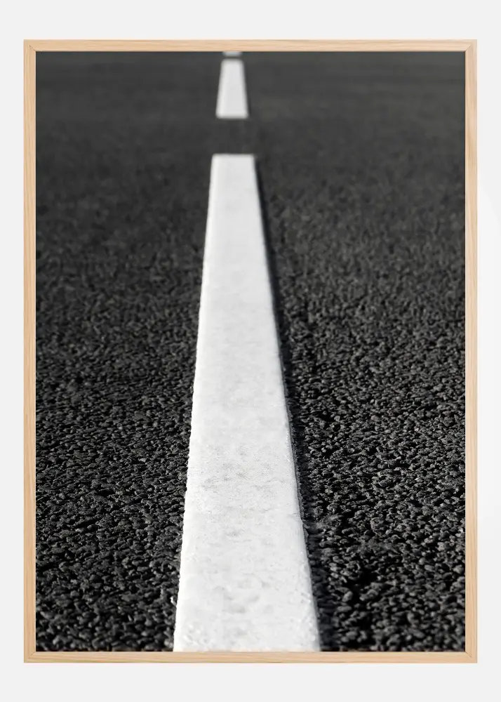 Ce poster artistique offre une nouvelle perspective sur la scène routière classique en se concentrant sur une ligne blanche qui s'étend à l'infini sur la surface noire de l'asphalte. La composition simple est à la fois puissante et méditative, un rappel de la nature du voyage et des chemins que nous choisissons dans la vie. C'est un élément de décoration parfait pour ceux qui recherchent une esthétique moderne et minimaliste dans leur maison ou bureau.