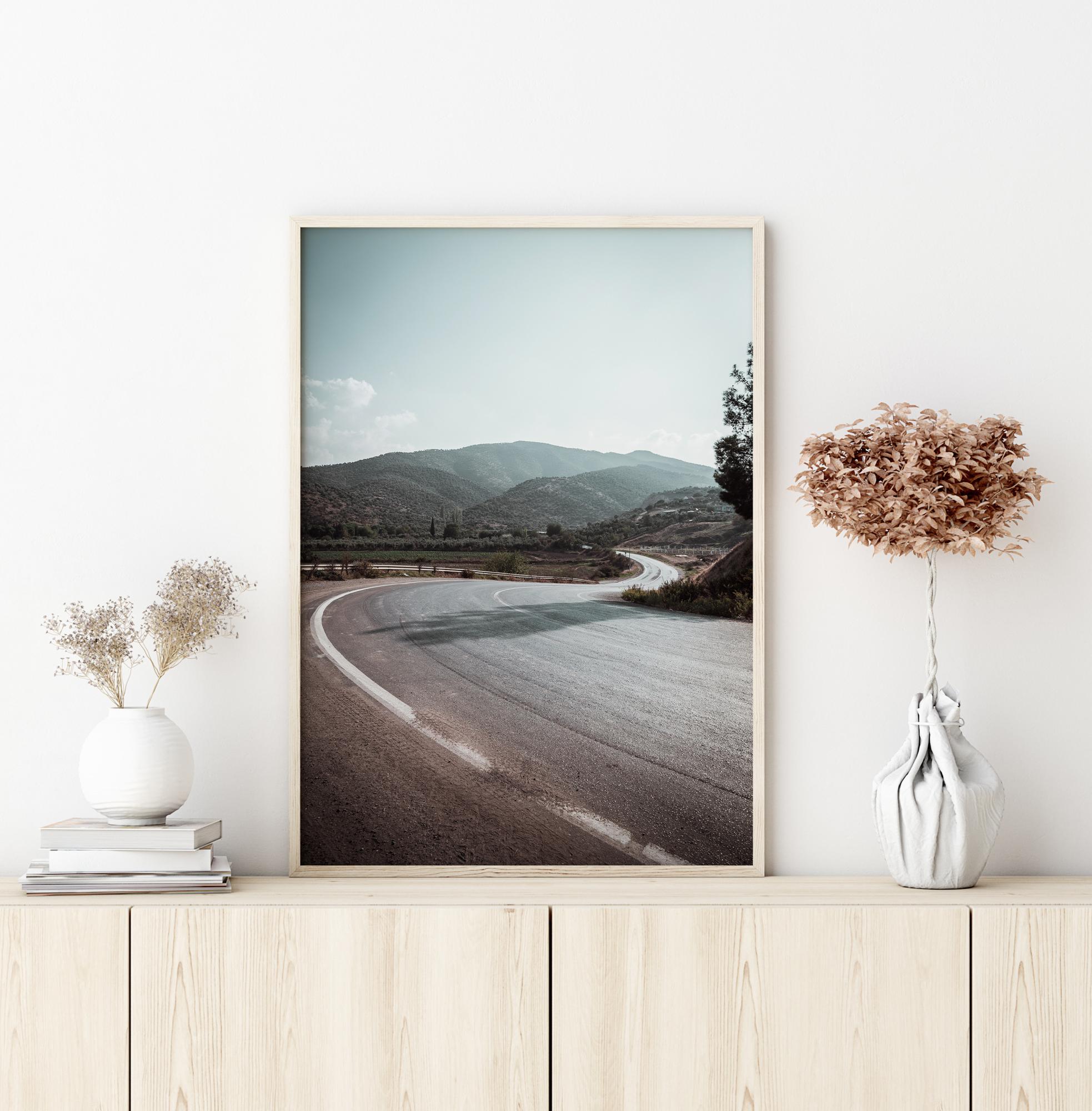 Une affiche pittoresque d'une route qui serpente à travers les montagnes. Une seule route goudronnée s'enfonce au loin jusqu'aux lointains sommets des montagnes. Les couleurs sont douces, rappelant une journée de printemps où l'on roule avec le toit ouvert. Obtenez cette sensation de douce brise grâce à ce poster.