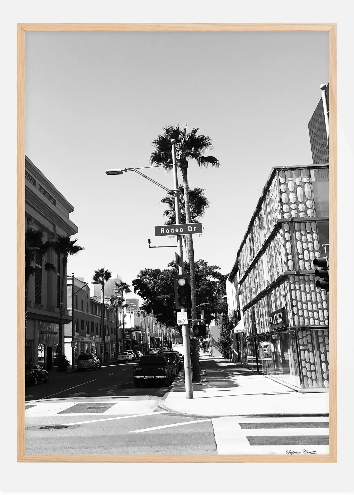 Ici, nous rencontrons l'un des nombreux motifs urbains quotidiens de Saphira Consilio, avec des palmiers et des voitures garées dans une agréable échelle de gris. Un poster agréablement quotidien en noir et blanc qui peut être avantageusement combiné avec quelque chose de notre autre gamme de Saphira Consilio.