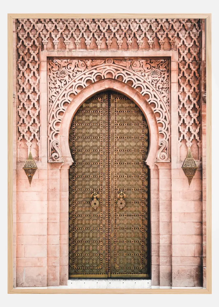 Une affiche architecturale d'une grande porte ou d'une entrée royale. Les murs en carreaux rouges sont dessinés de manière complexe lorsqu'ils entourent les courbes des portes dorées. Imaginez ce qui se trouve au-delà de ces portes dorées en ramenant cette superbe affiche dans votre maison.
