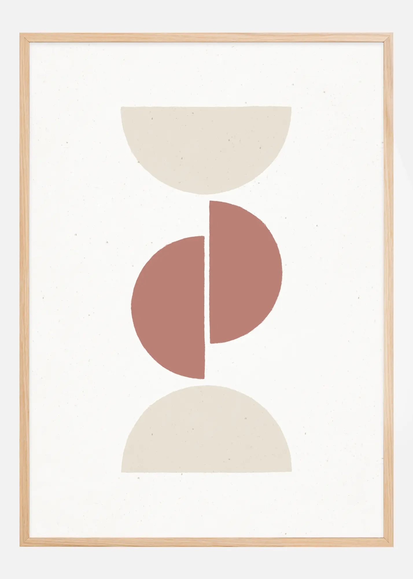 Cette affiche artistique, intitulée 'Rust and Sand - Geo', présente une composition de formes géométriques abstraites dans un équilibre harmonieux de couleurs terreuses. Le design combine des demi-lunes et des segments de cercle dans des nuances rouillées rouges et sableuses qui se mettent mutuellement en valeur et créent une sensation d'espace et d'équilibre. C'est une interprétation élégante et moderne du minimalisme géométrique qui s'intègre parfaitement dans un intérieur scandinave ou contemporain.