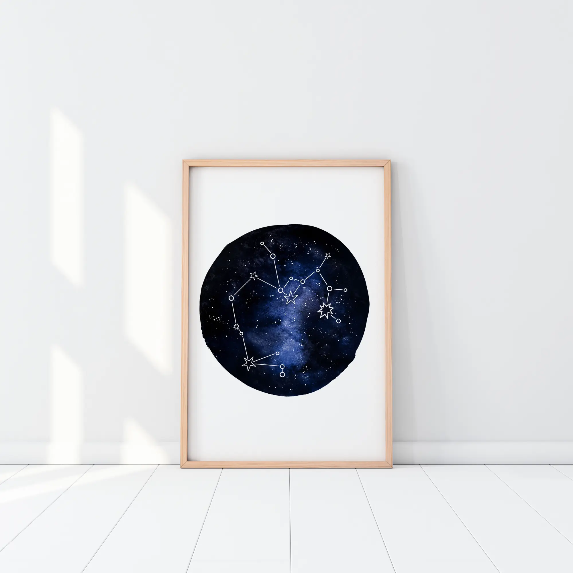Un poster astrologique du signe du zodiaque Sagittaire. Un grand orbe bleu profond est suspendu au centre d'un fond blanc. À l'intérieur du cercle se trouve la galaxie et de nombreuses étoiles pour créer une image magique. Le signe du zodiaque, Sagittaire, est clairement visible.