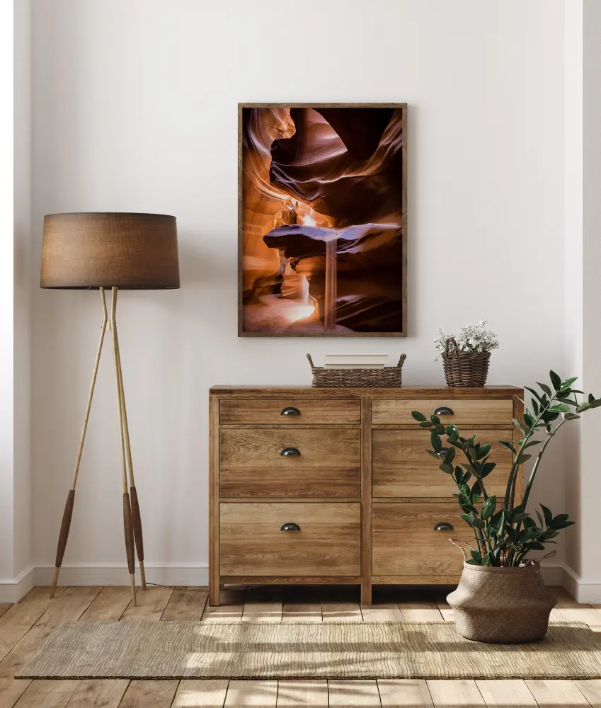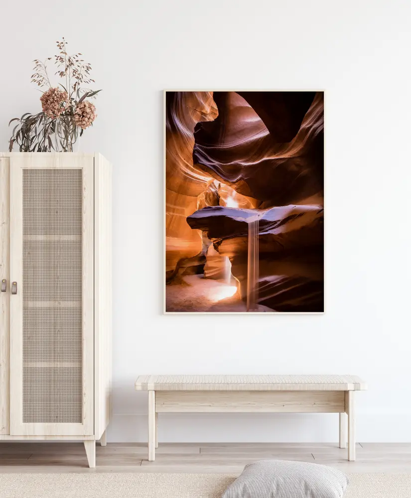 Une affiche spectaculaire de l'intérieur d'une grotte rocheuse où le sable tombe en cascade sur le sol. La lumière du soleil s'infiltre dans la grotte, illuminant les roches d'un rouge profond et créant une étonnante ambiance chaleureuse. Le sable qui coule ressemble à une cascade dans cette image fascinante.