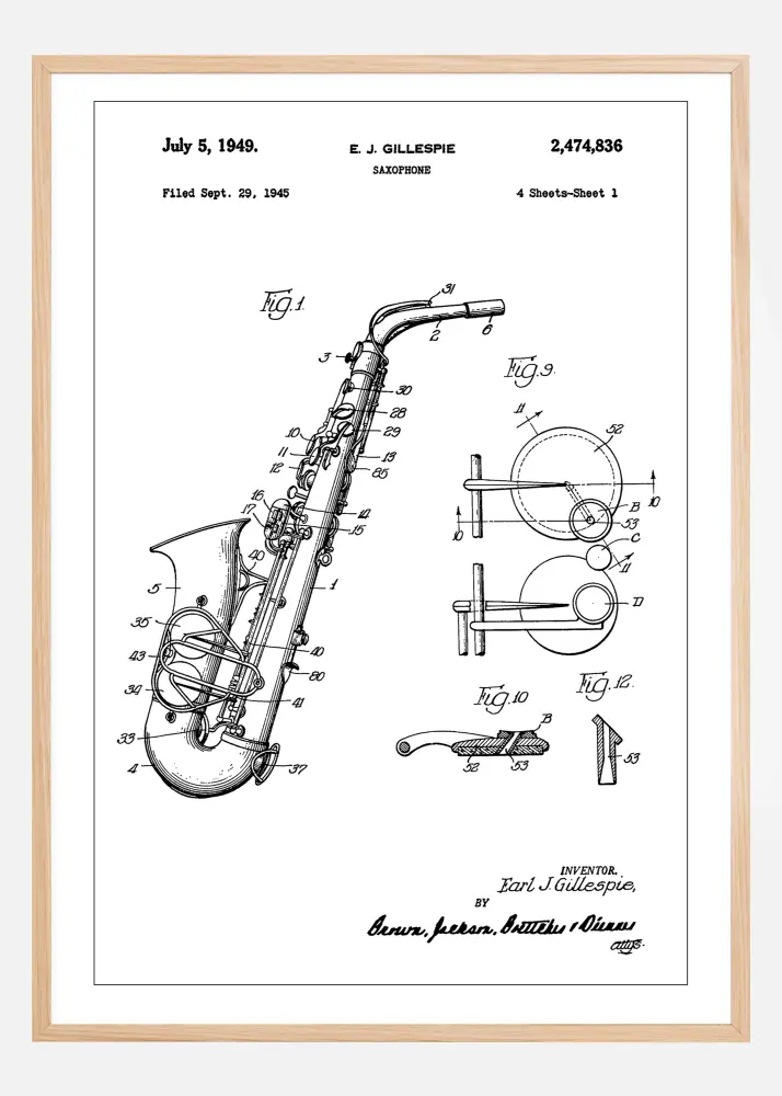 Cette affiche de brevet détaillée présente le dessin du brevet d'un saxophone, daté du 5 juillet 1949. C'est un exemple exceptionnel de la construction technique et du design de l'instrument de musique, mis en valeur par les lignes claires et les marques précises du brevet. Pour les amateurs de musique, les fabricants d'instruments et les connaisseurs de schémas rares, cette affiche de brevet est un hommage élégant au processus créatif derrière la fabrication d'un saxophone.