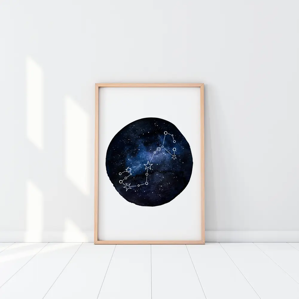 Une affiche horoscope du signe du Scorpion. Un grand cercle bleu foncé flotte sur un fond blanc. À l'intérieur, se trouve la galaxie et des centaines d'étoiles différentes. Le signe du zodiaque du Scorpion apparaît en gras en haut de l'affiche. Un petit plus parfait si vous souhaitez mettre en valeur votre signe astrologique.