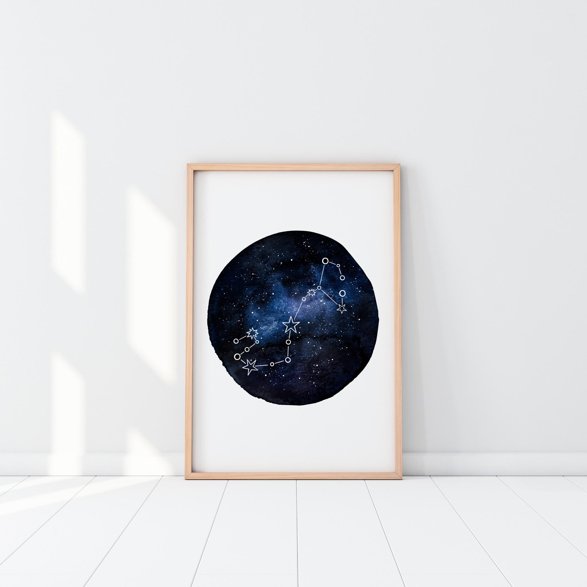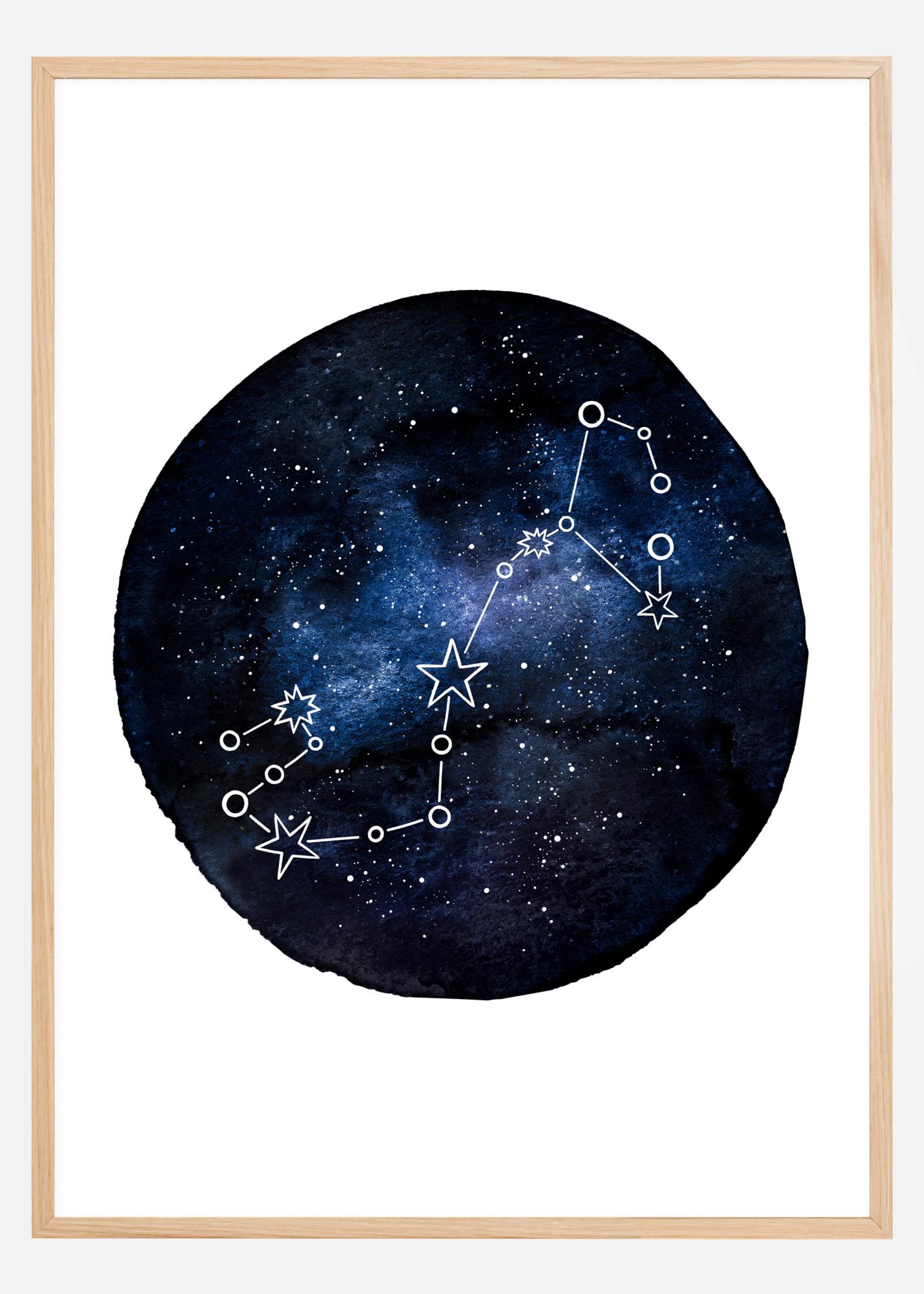 Une affiche horoscope du signe du Scorpion. Un grand cercle bleu foncé flotte sur un fond blanc. À l'intérieur, se trouve la galaxie et des centaines d'étoiles différentes. Le signe du zodiaque du Scorpion apparaît en gras en haut de l'affiche. Un petit plus parfait si vous souhaitez mettre en valeur votre signe astrologique.