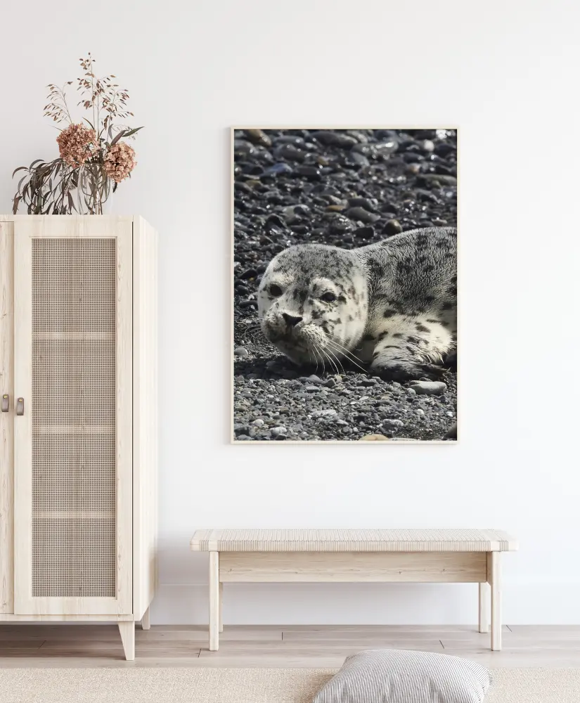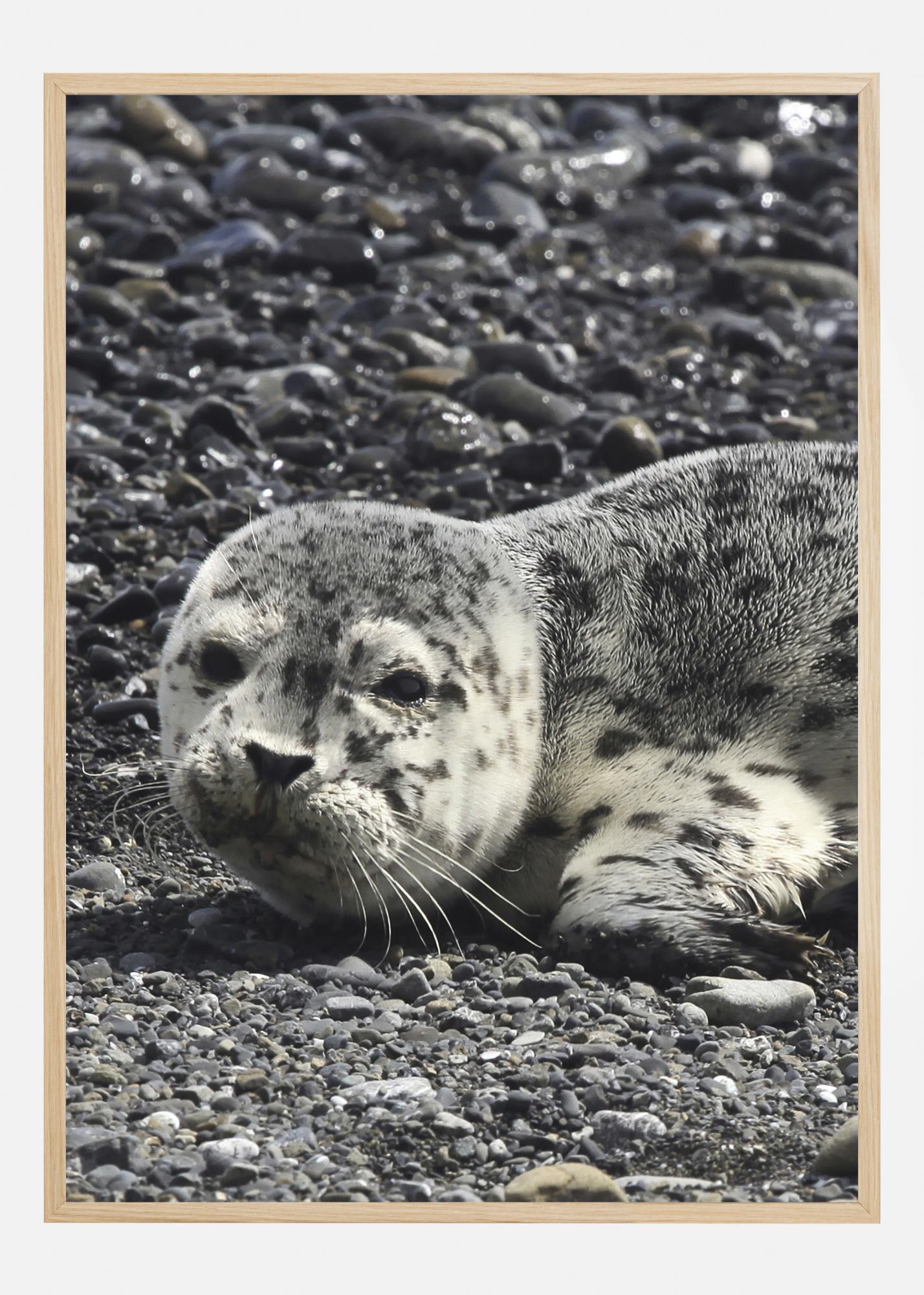 Une magnifique affiche animalière représentant un phoque sur un rivage rocheux. Le phoque gris commun est assis sur les rochers, presque camouflé. Les taches sur son pelage reflètent les cailloux derrière lui. Fixez ses yeux vivants en ramenant chez vous ce poster marin.
