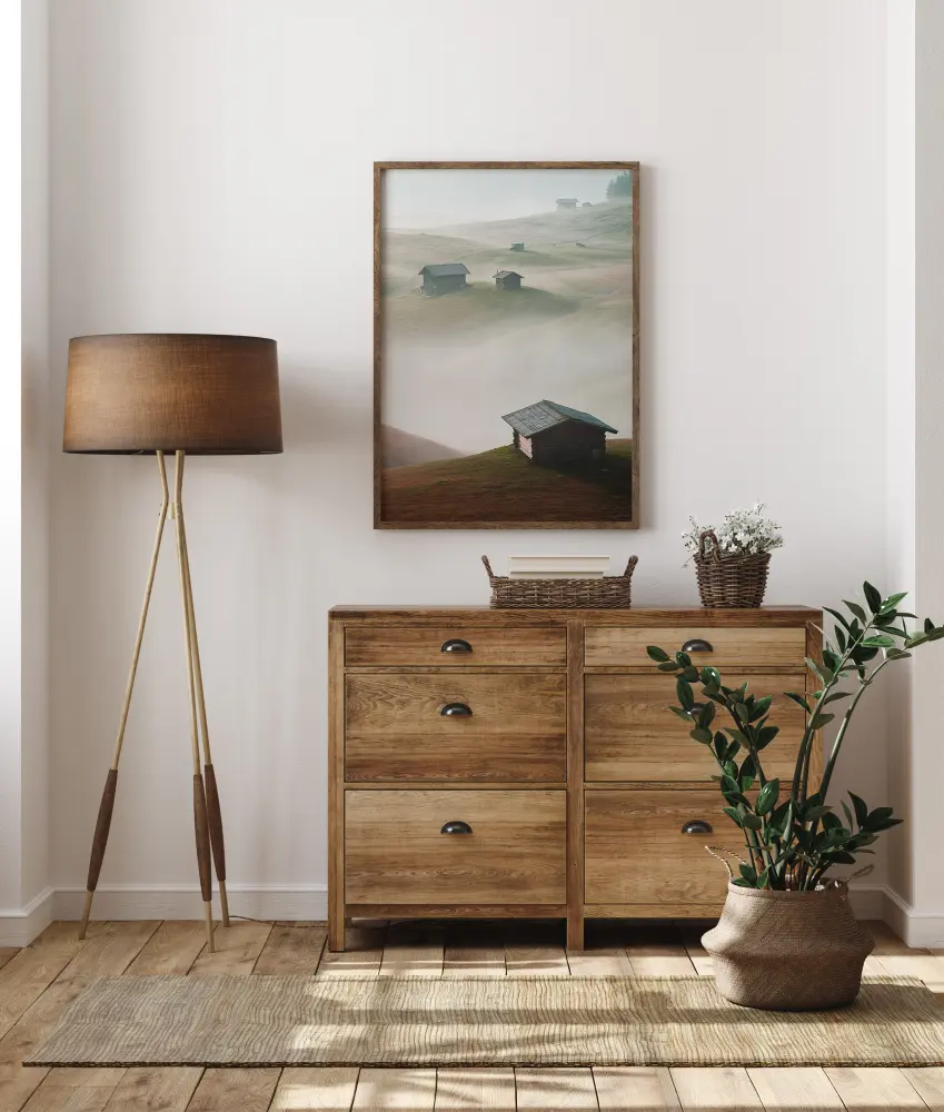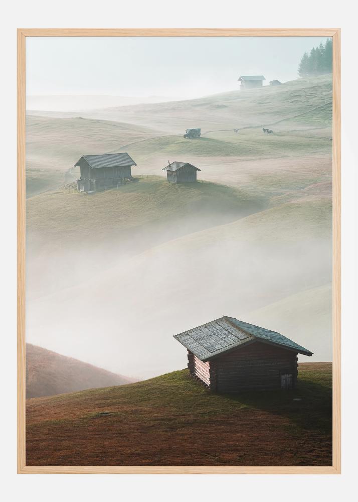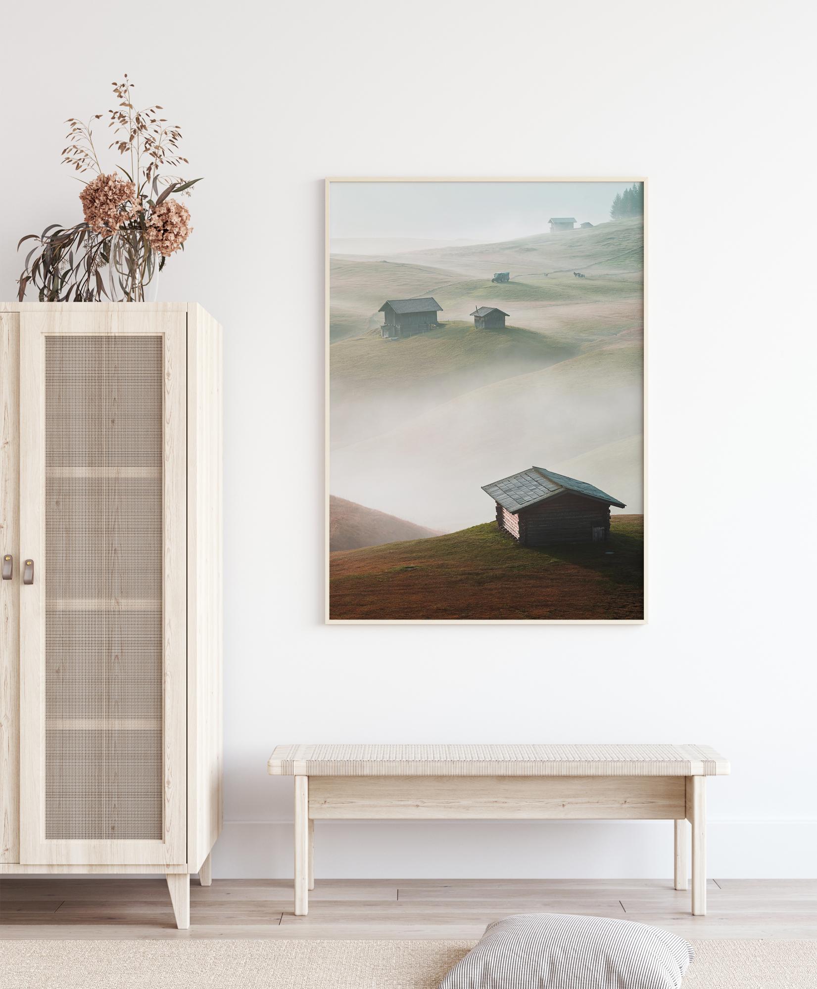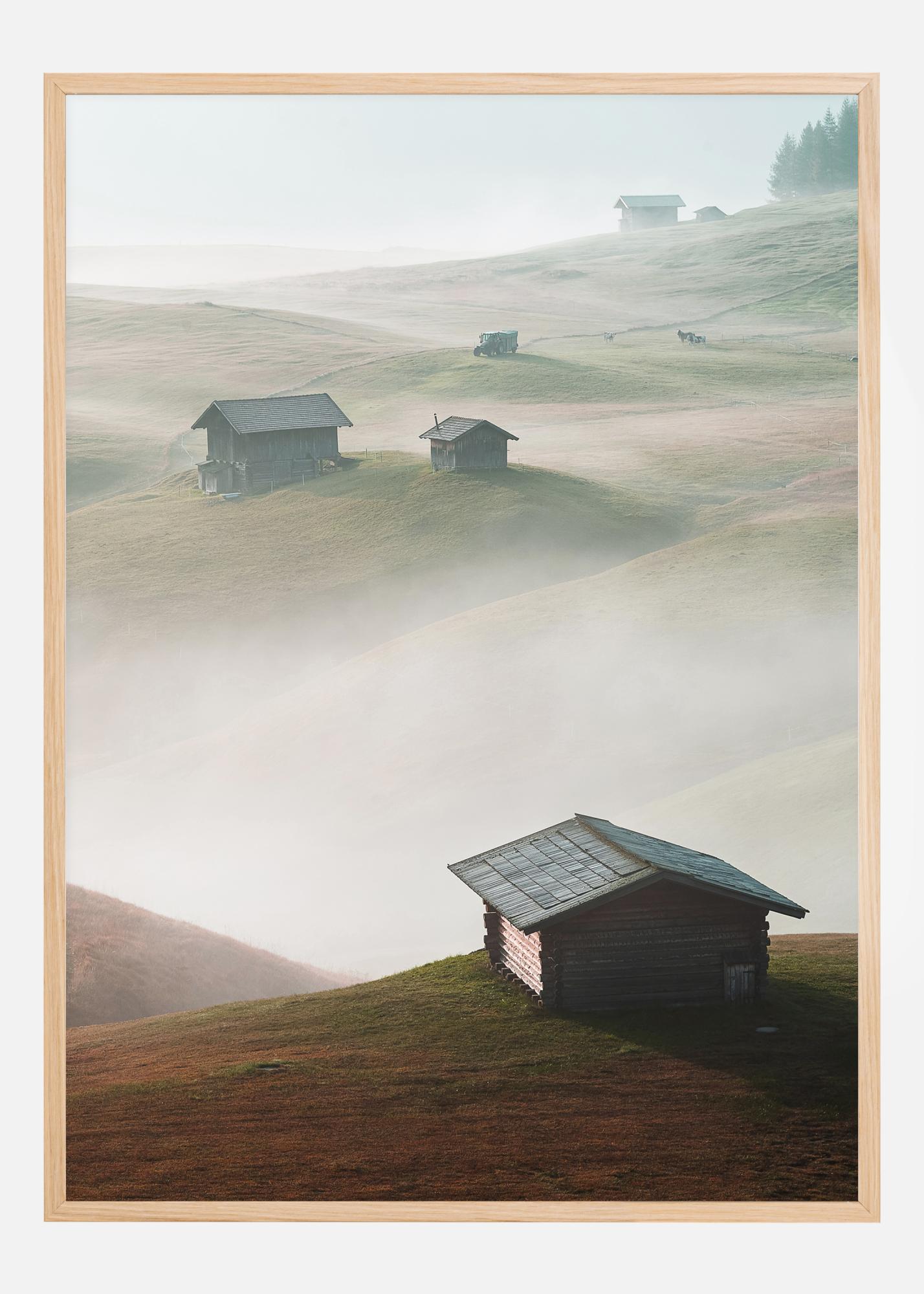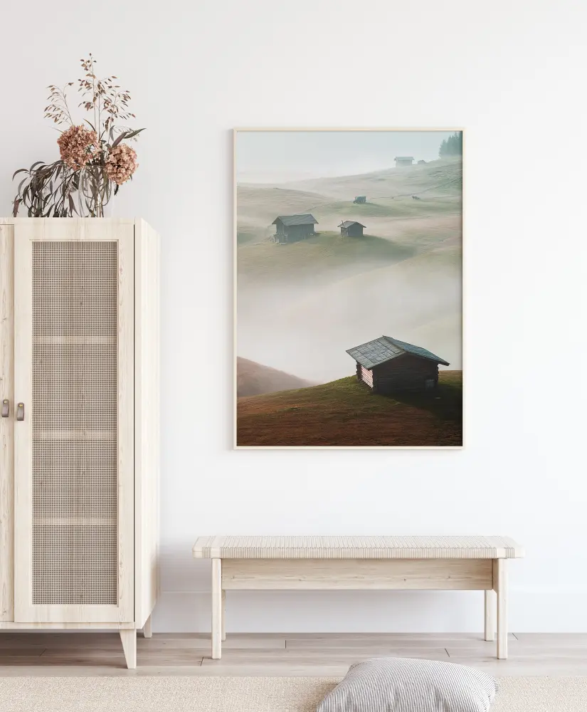 Une affiche magique de maisons assises sur des collines surplombant la brume et les nuages en contrebas. Chaque petite cabane se détache sur les collines verdoyantes. La brume qui les sépare donne l'impression que des îles les séparent les unes des autres. Perdez-vous dans ce vaste panorama.