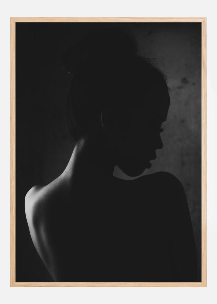 Un portrait mystérieux d'une jeune femme qui a le dos tourné. Éclairée par la gauche, son épaule est soulignée d'une lueur blanche. Le reste de son corps est dans l'ombre. Les lèvres entrouvertes, elle tourne à moitié de tête pour vous regarder par-dessus son épaule dans cette affiche sensuelle.