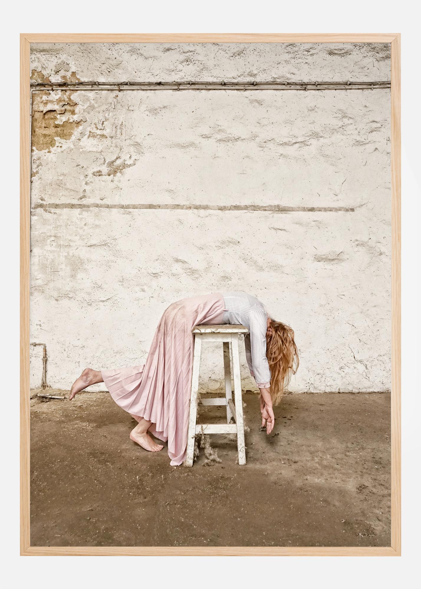 Cette affiche captivante capture une scène inhabituelle et chargée d'émotion. Une personne est représentée dans une position suggestive sur un tabouret blanc usé, avec la tête inclinée vers le bas et le bras élégamment étendu vers le sol en béton nu. La tenue de la personne se compose d'une jupe rose clair et d'une chemise rayée, qui, avec le fond brut d'un mur usé, créent un contraste visuel fort. La couleur rose pâle de la jupe et les tons doux de blanc et de bleu de la chemise sont en belle harmonie avec les nuances neutres du mur et le tabouret en bois vieilli.