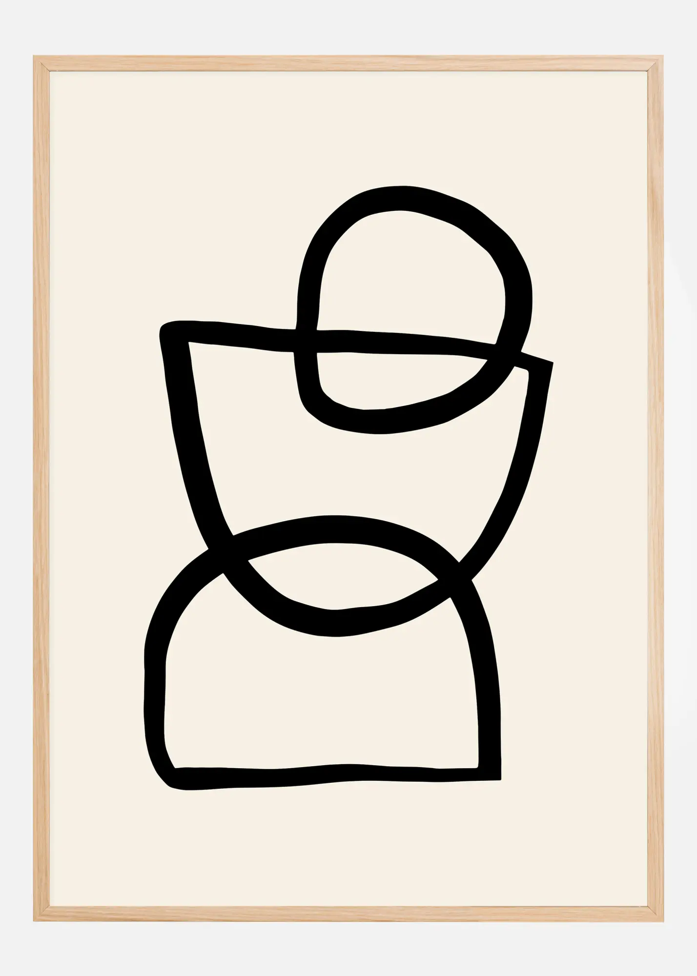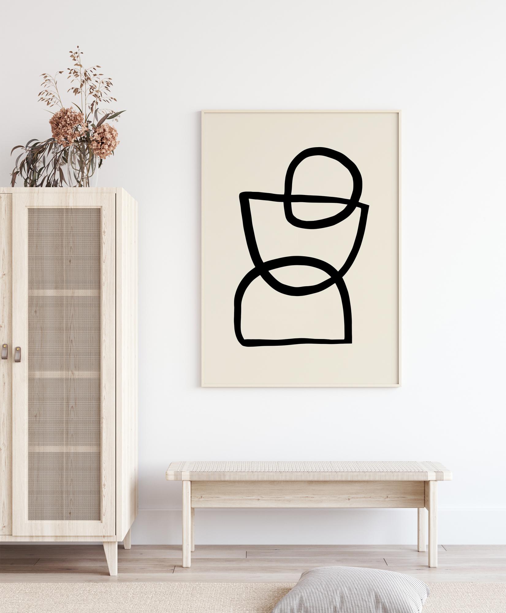 Un poster abstrait amusant de trois formes différentes, chacune dessinée dans une ligne noire audacieuse. Il y a deux demi-cercles et un cercle complet en haut. Ils se croisent pour créer un motif abstrait. Accrochez cette affiche chez vous et interprétez l'image exactement comme vous le souhaitez. S'agit-il d'une personne, d'un coquetier, d'un sablier ? C'est vous qui décidez.