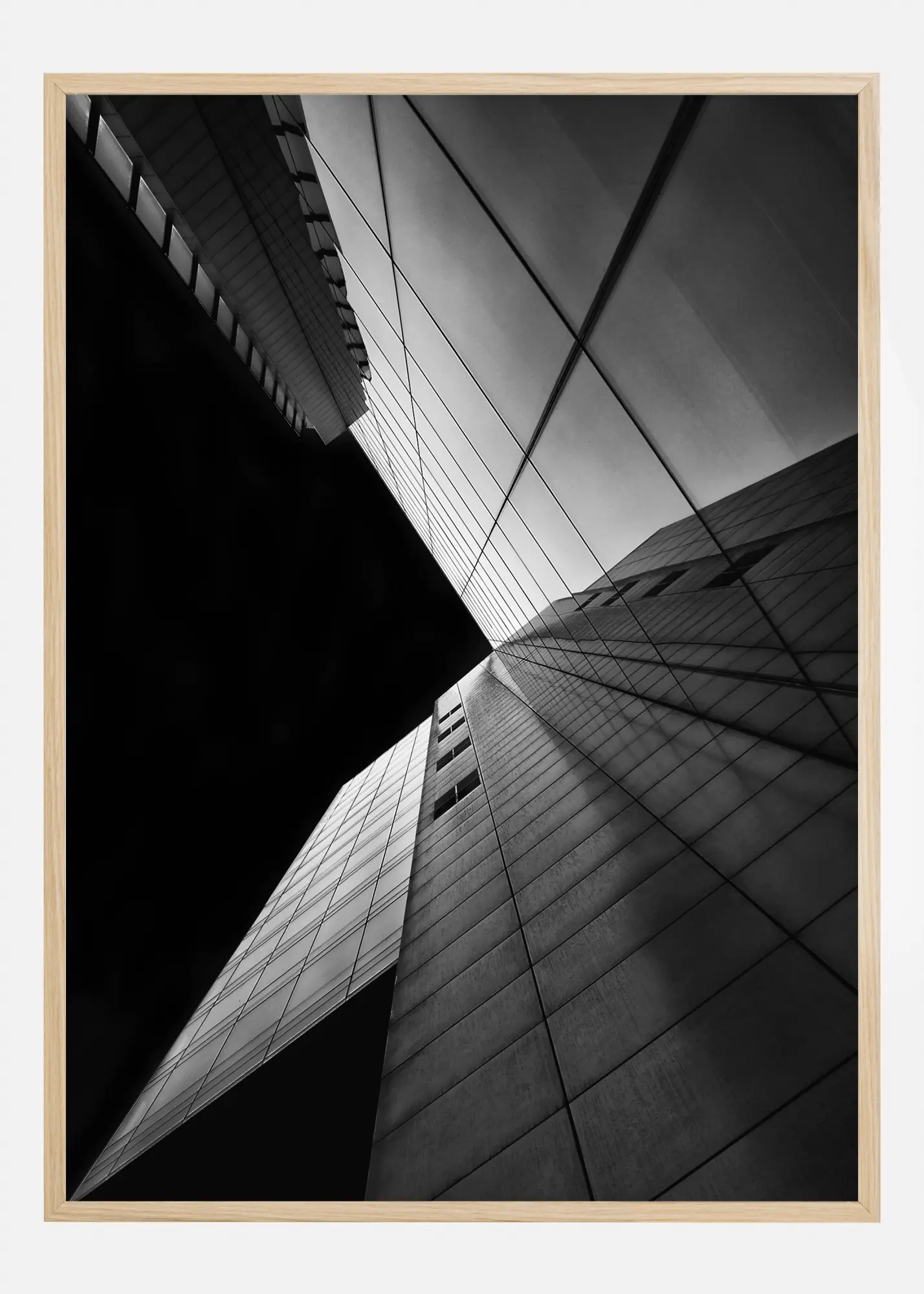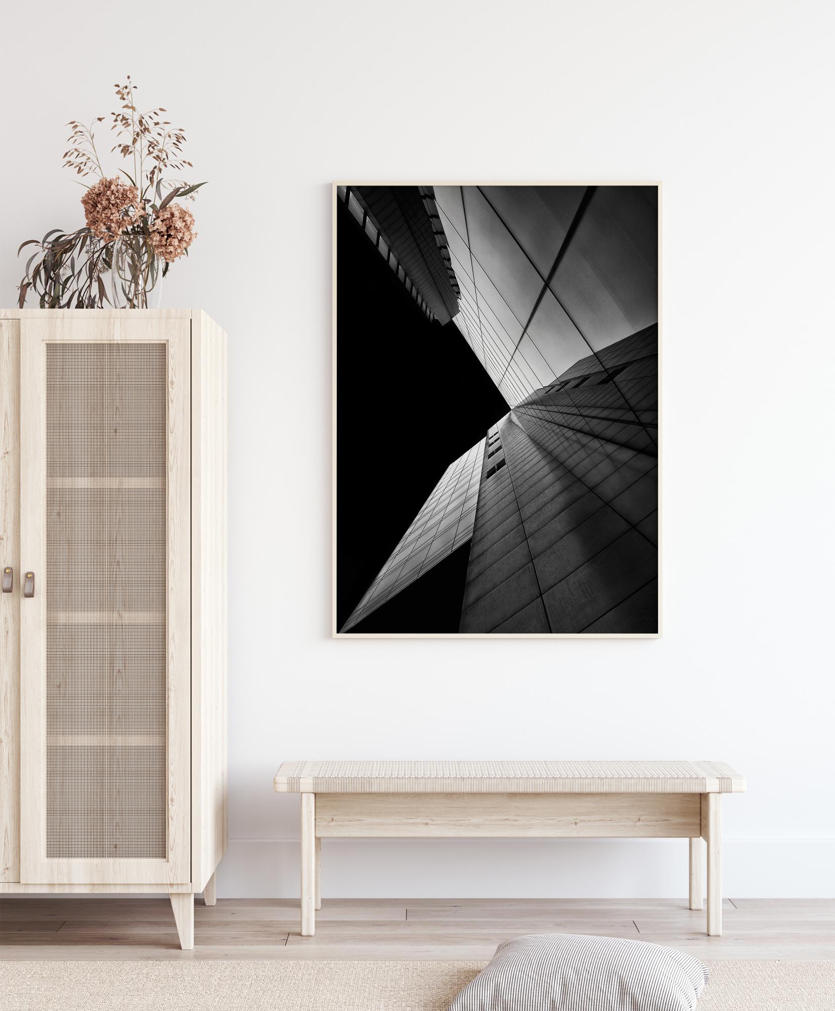 Une affiche architecturale en noir et blanc représentant le côté d'un bâtiment la nuit. Les lignes géométriques des fenêtres conduisent l'œil vers le centre de la photo. Des bâtiments d'un blanc éclatant se reflètent dans le verre, le ciel nocturne offrant un fort contraste avec le côté du bâtiment. Associez-la à un mur de couleur pour accentuer ce contraste.