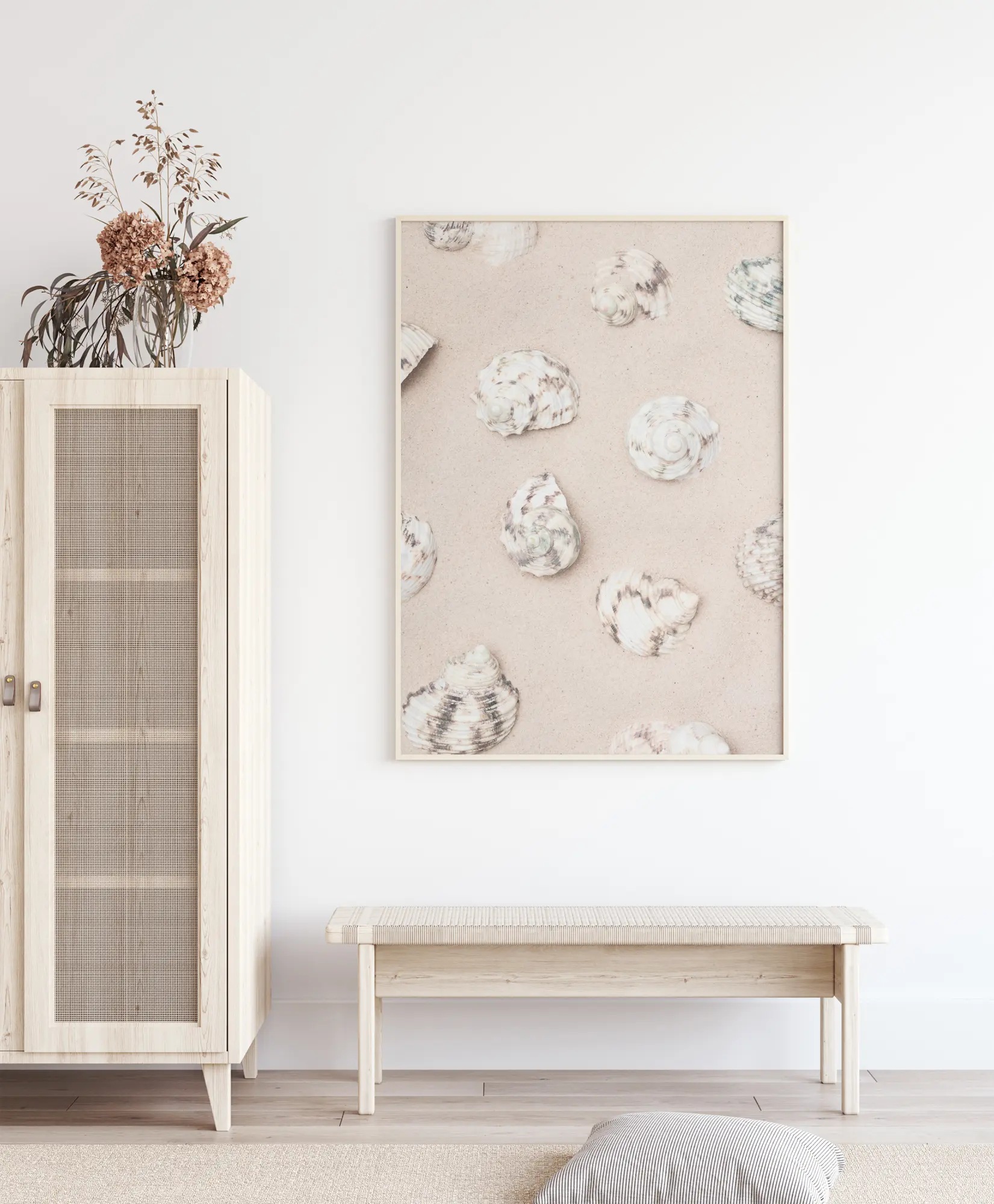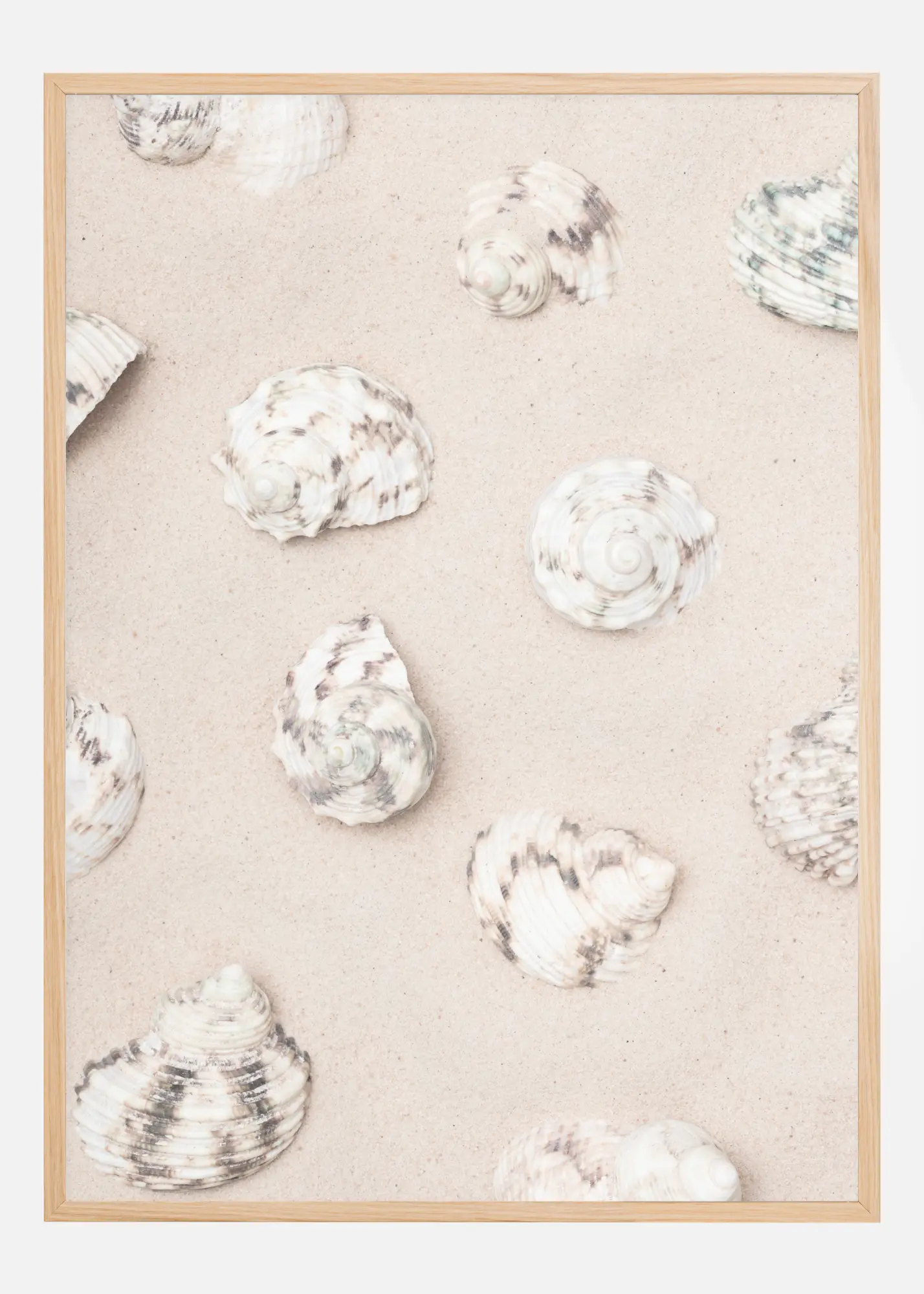 Une affiche pastel de coquillages sur un fond rose pâle. Douze coquillages ondulés sont disposés uniformément sur l'image. Chaque coquillage est blanc et brun, ce qui donne une image très douce, parfaite pour ajouter re relief à un mur monochrome..