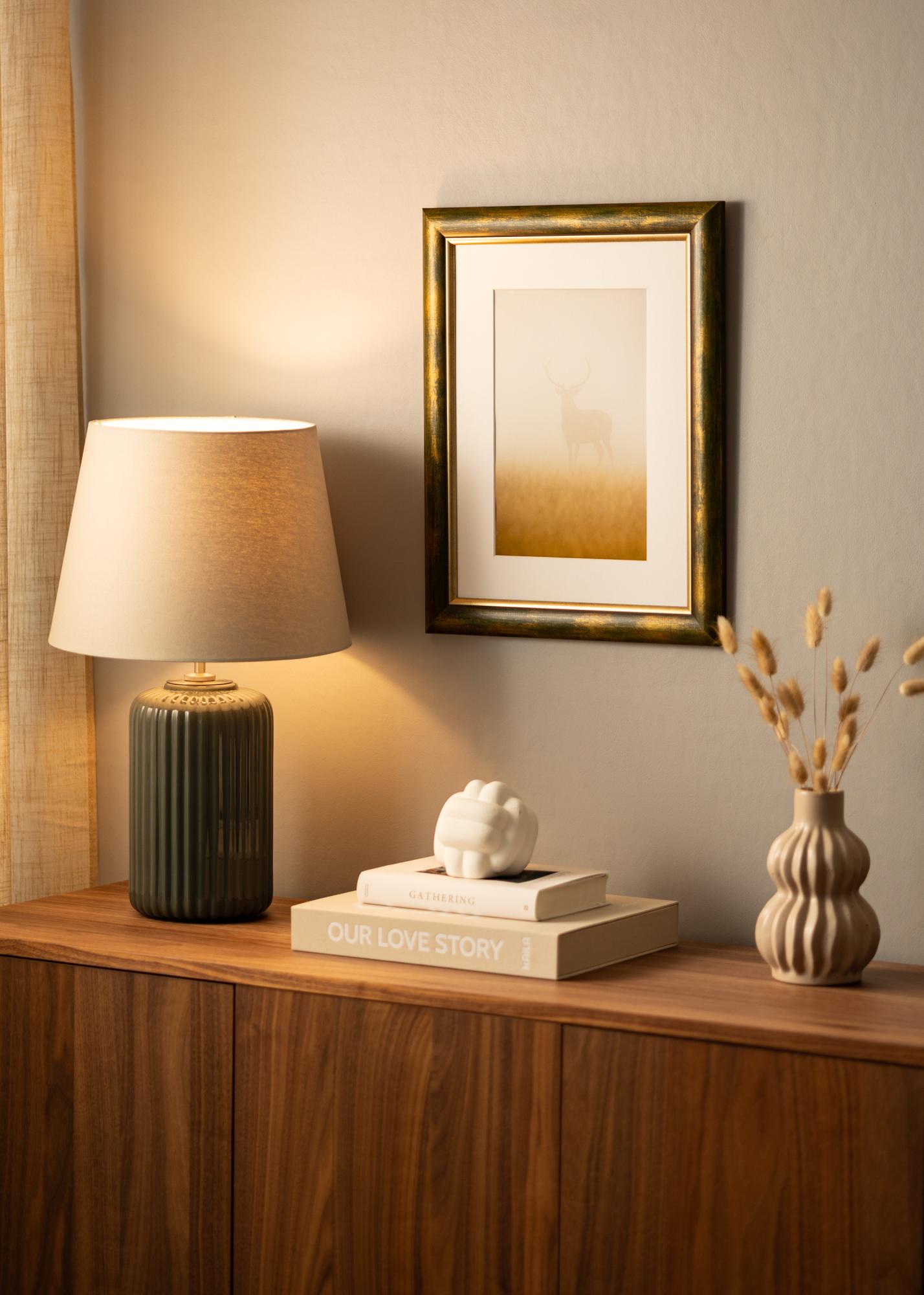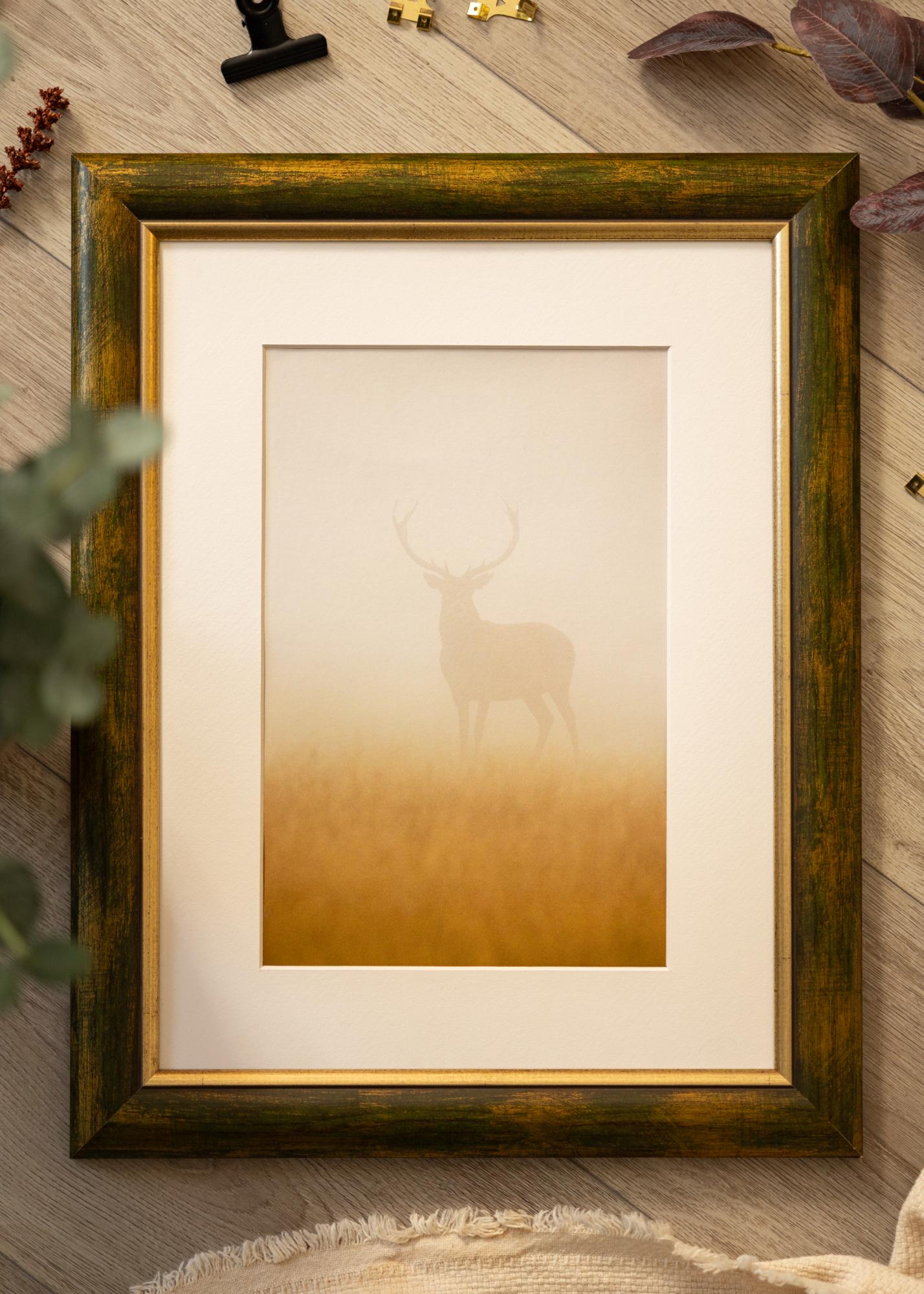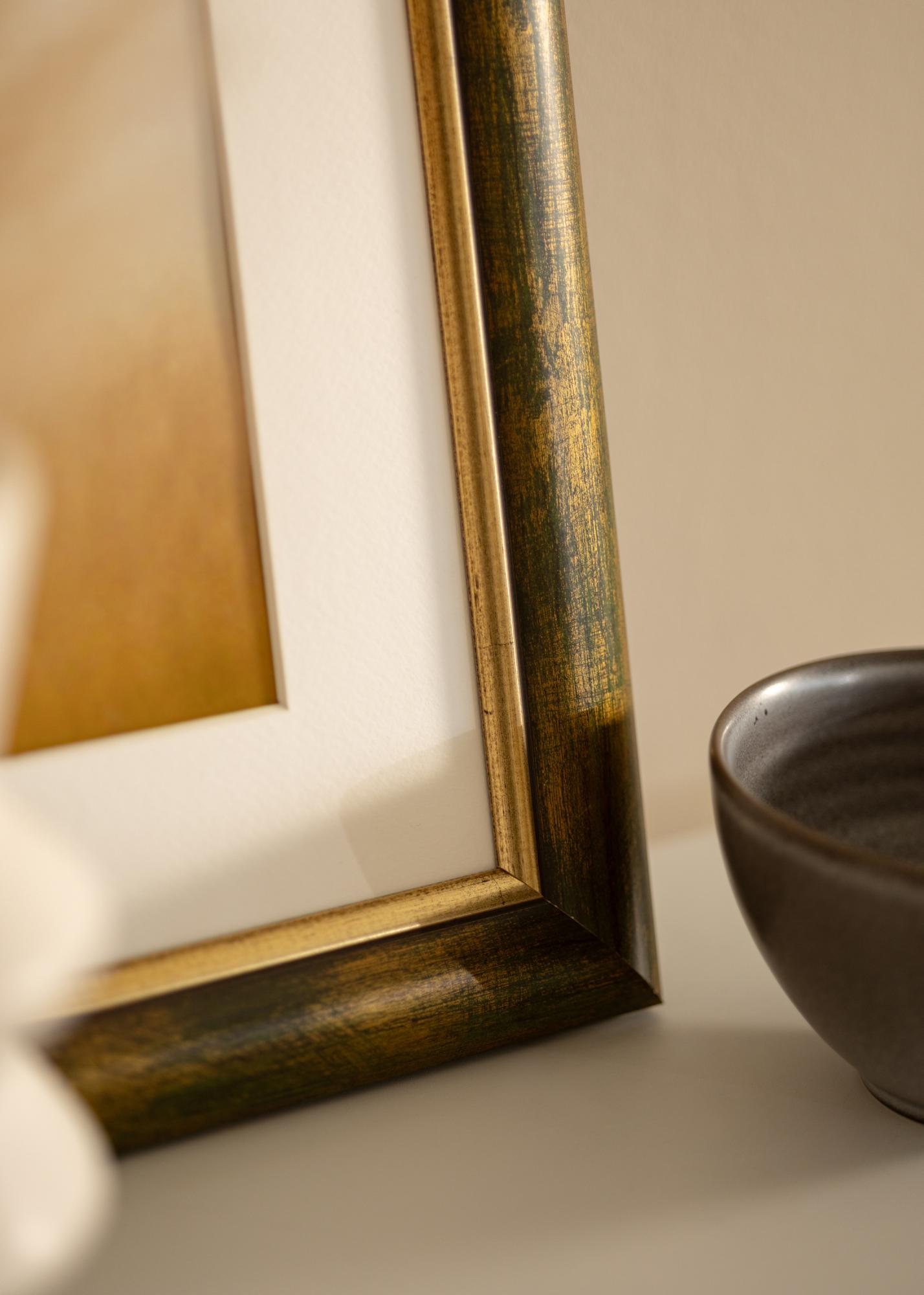 Cadre en bois intemporel fabriqué en Finlande, à la belle surface en bois de ton vert et une bordure dorée courant le long du motif. Donne une sensation harmonieuse au motif. Ce cadre a un profil large de pas moins de 41 mm et une profondeur de 19 mm, ce qui donne une profondeur supplémentaire à l'encadrement.