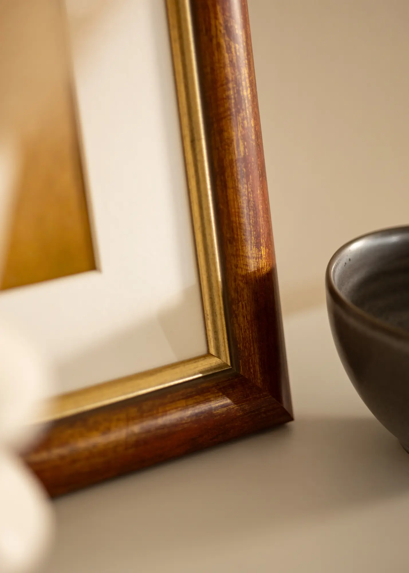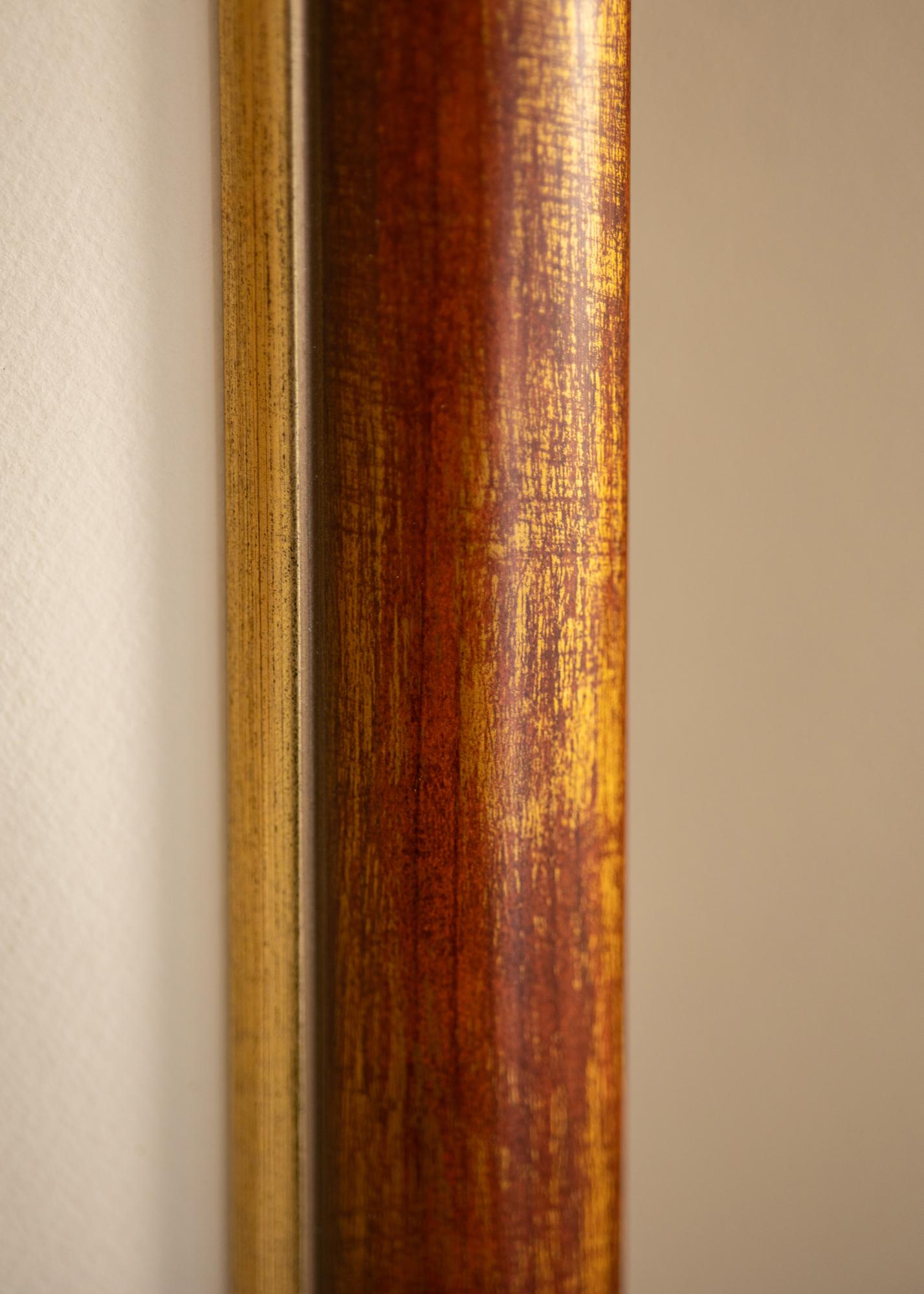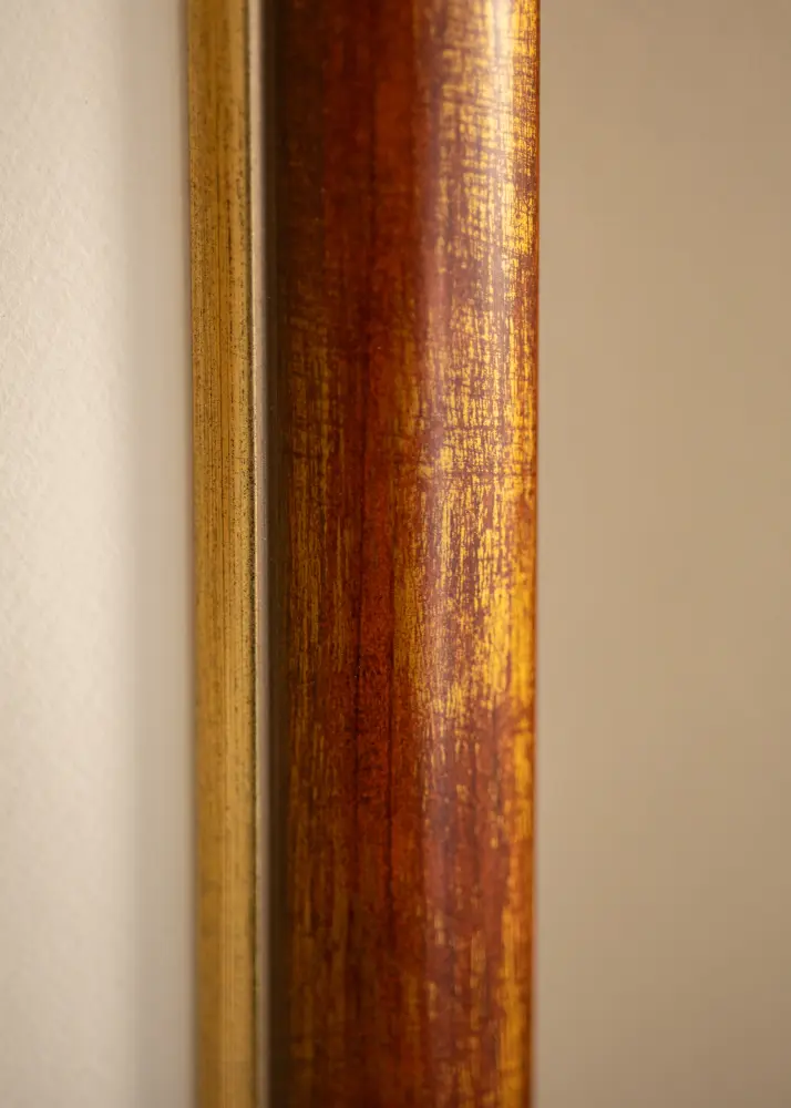 Cadre en bois intemporel fabriqué en Finlande, à la belle surface en bois de ton rouge et une bordure dorée courant le long du motif. Donne une sensation harmonieuse au motif. Ce cadre a un profil large de pas moins de 41 mm et une profondeur de 19 mm, ce qui donne une profondeur supplémentaire à l'encadrement.