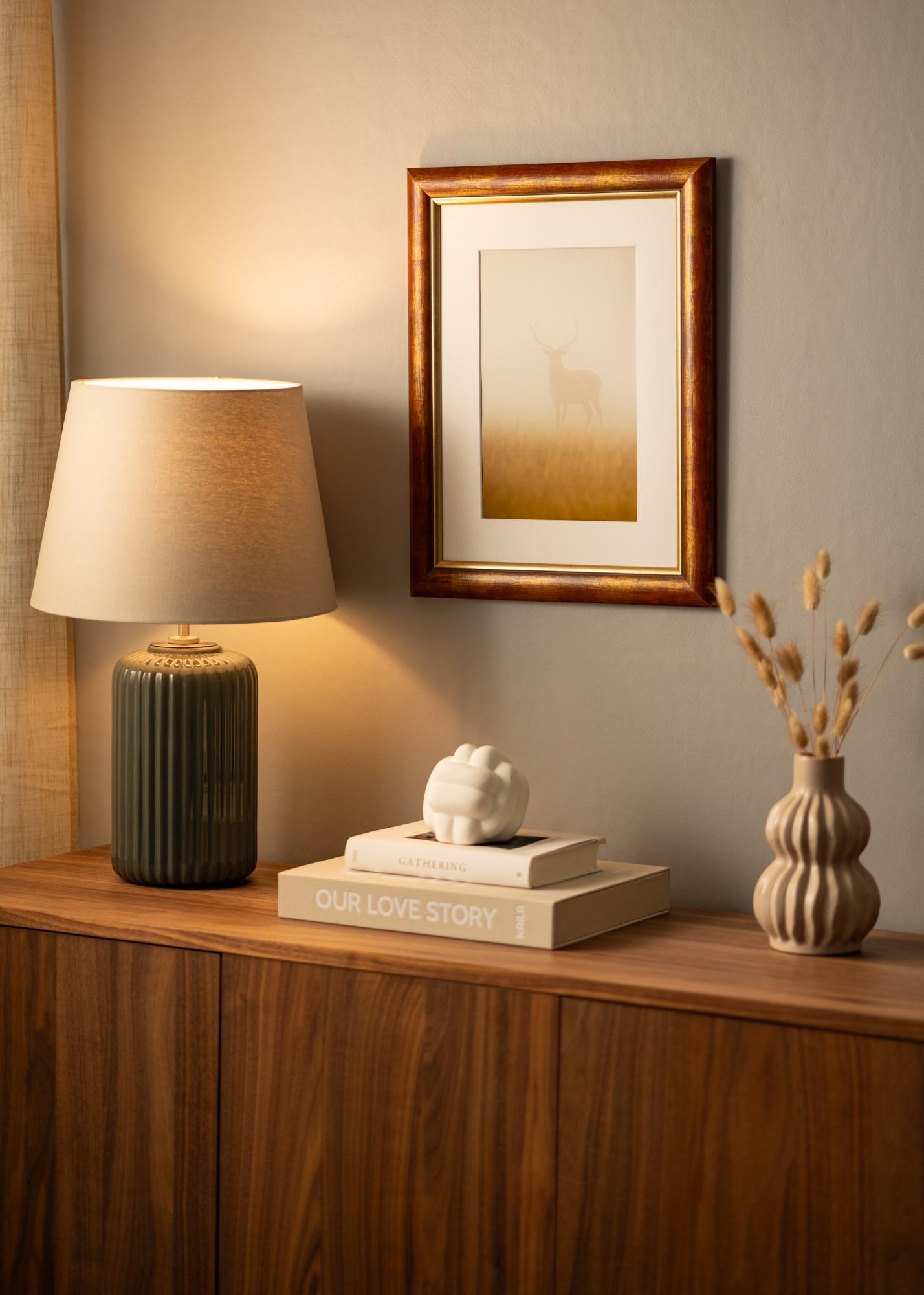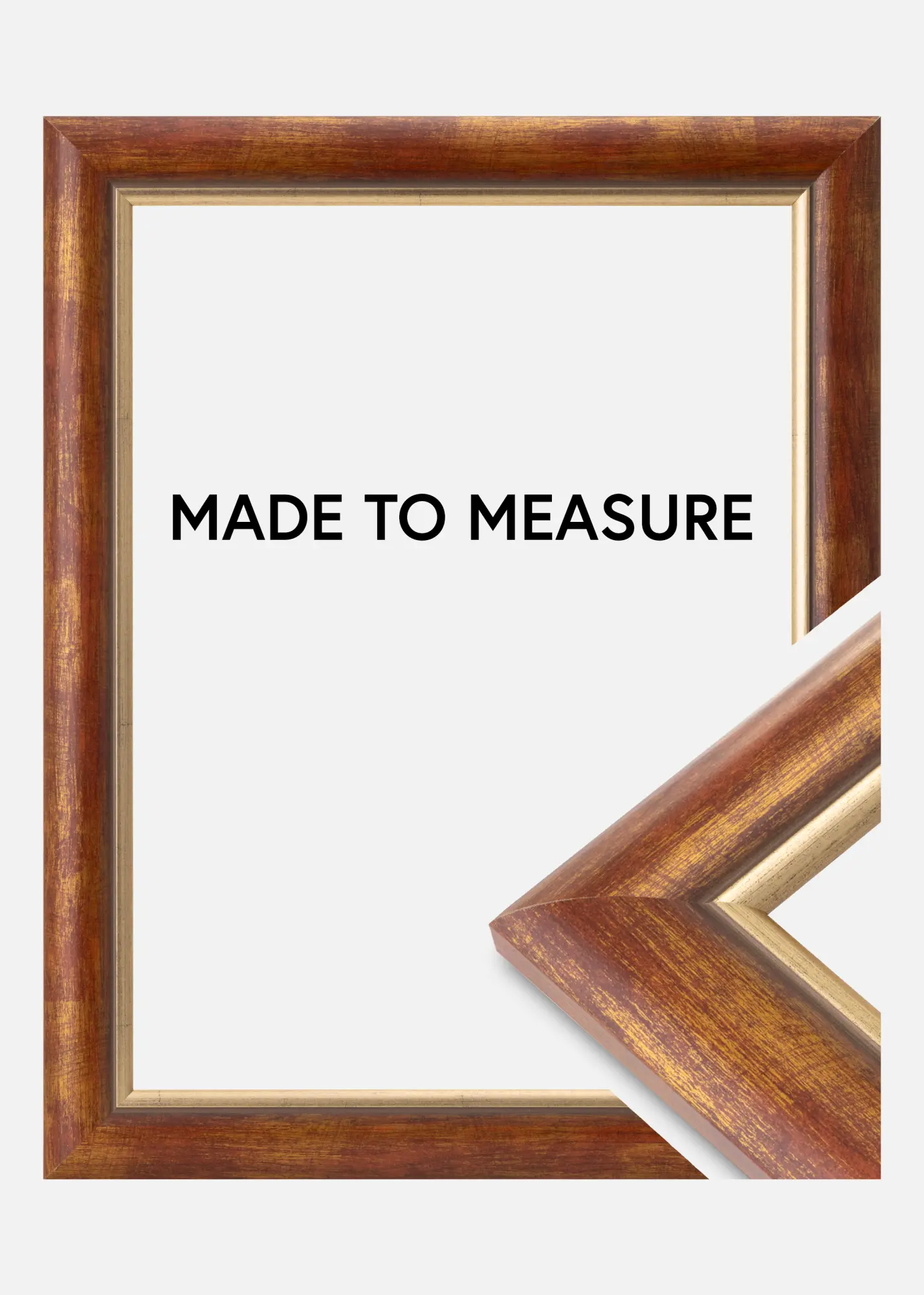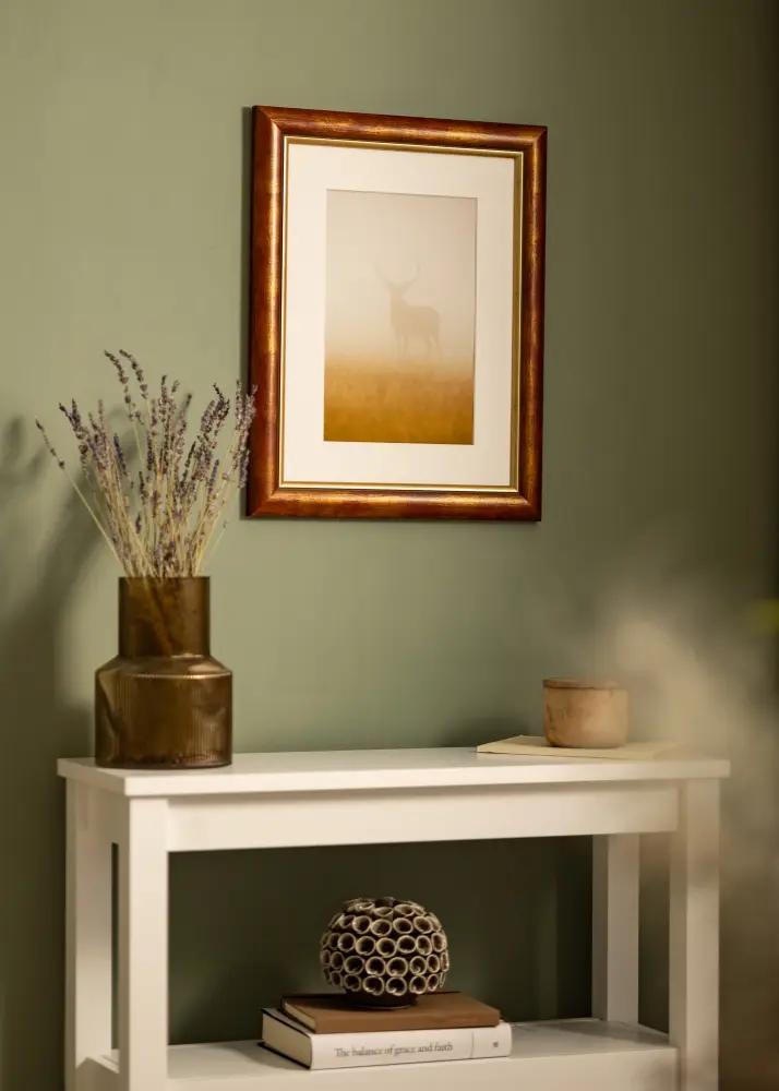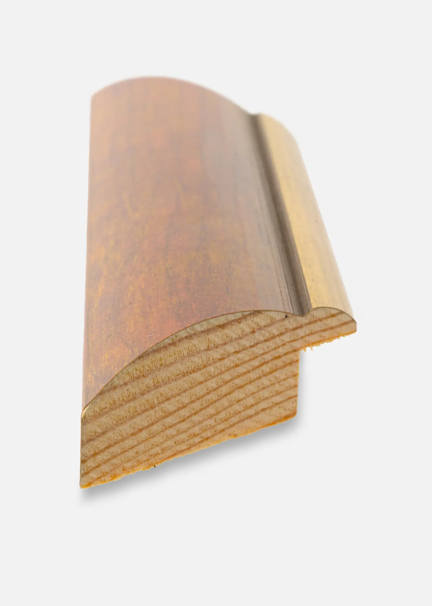 Cadre en bois intemporel fabriqué en Finlande, à la belle surface en bois de ton rouge et une bordure dorée courant le long du motif. Donne une sensation harmonieuse au motif. Ce cadre a un profil large de pas moins de 41 mm et une profondeur de 19 mm, ce qui donne une profondeur supplémentaire à l'encadrement.