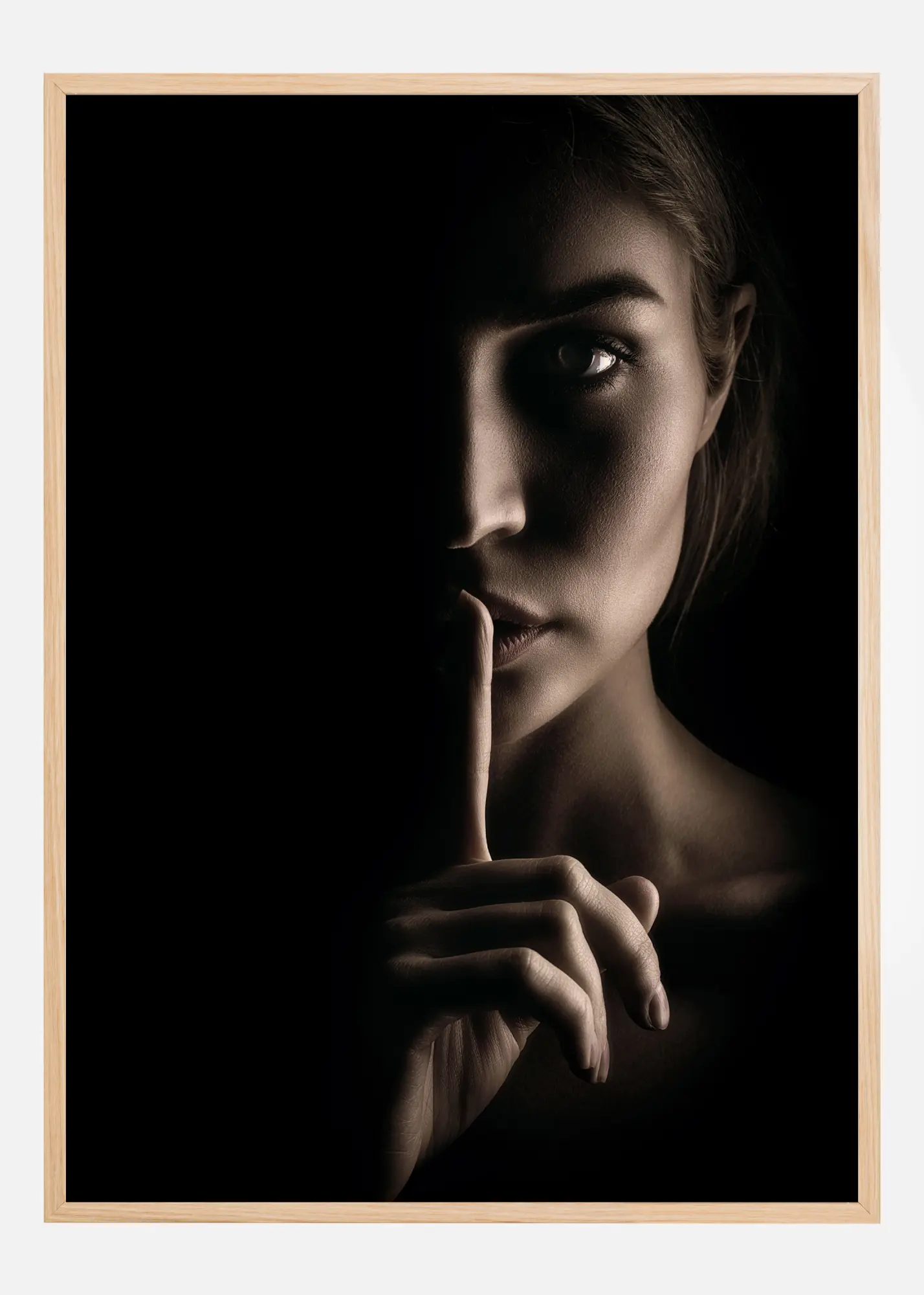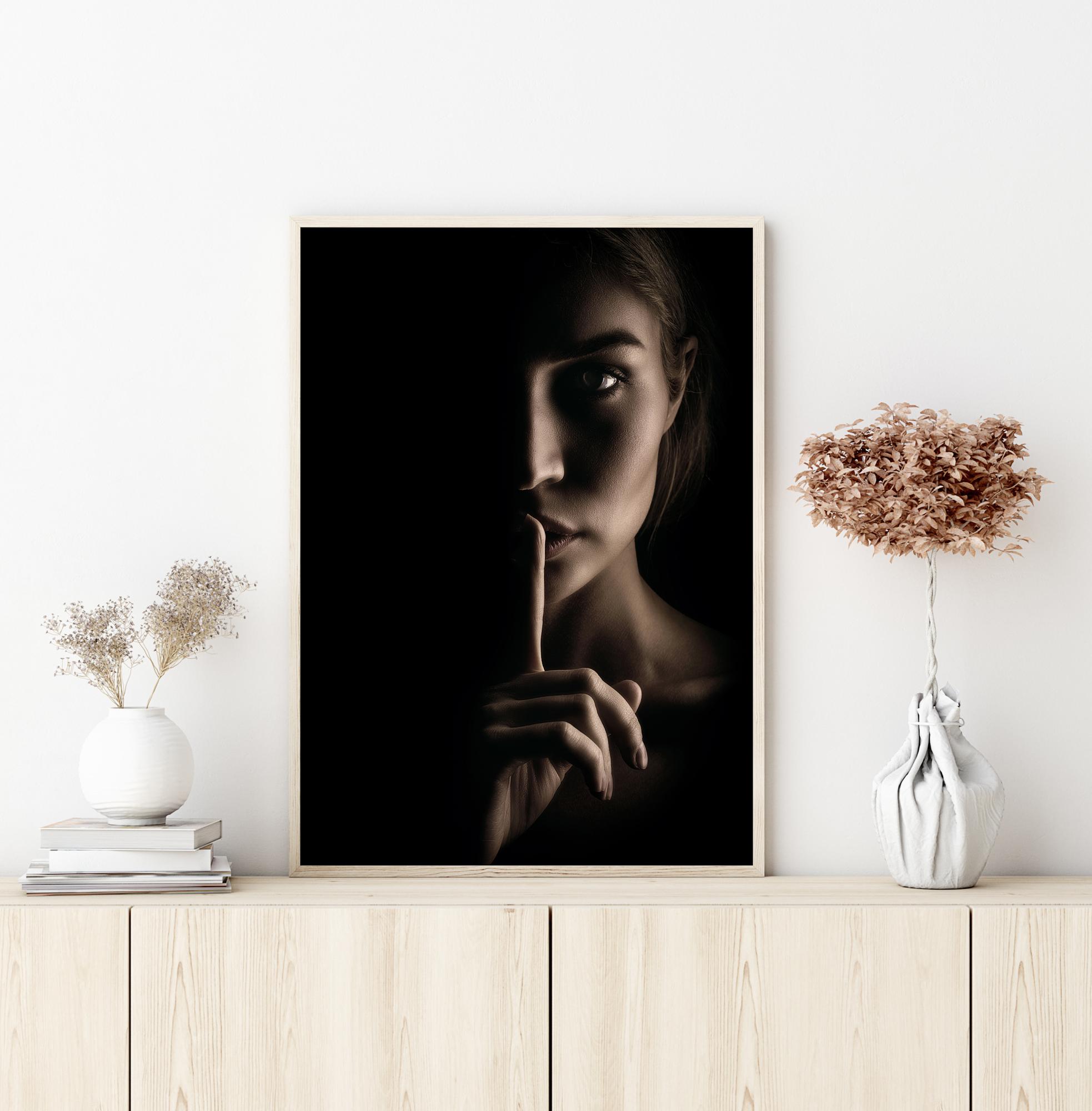 Un portrait mystérieux d'une femme dont le visage est à moitié dans l'ombre. Un doigt est levé sur ses lèvres pour vous faire taire alors qu'elle vous regarde droit dans les yeux. L'éclairage spectaculaire de cette affiche crée une douce lueur d'un côté et la plonge dans l'ombre de l'autre.